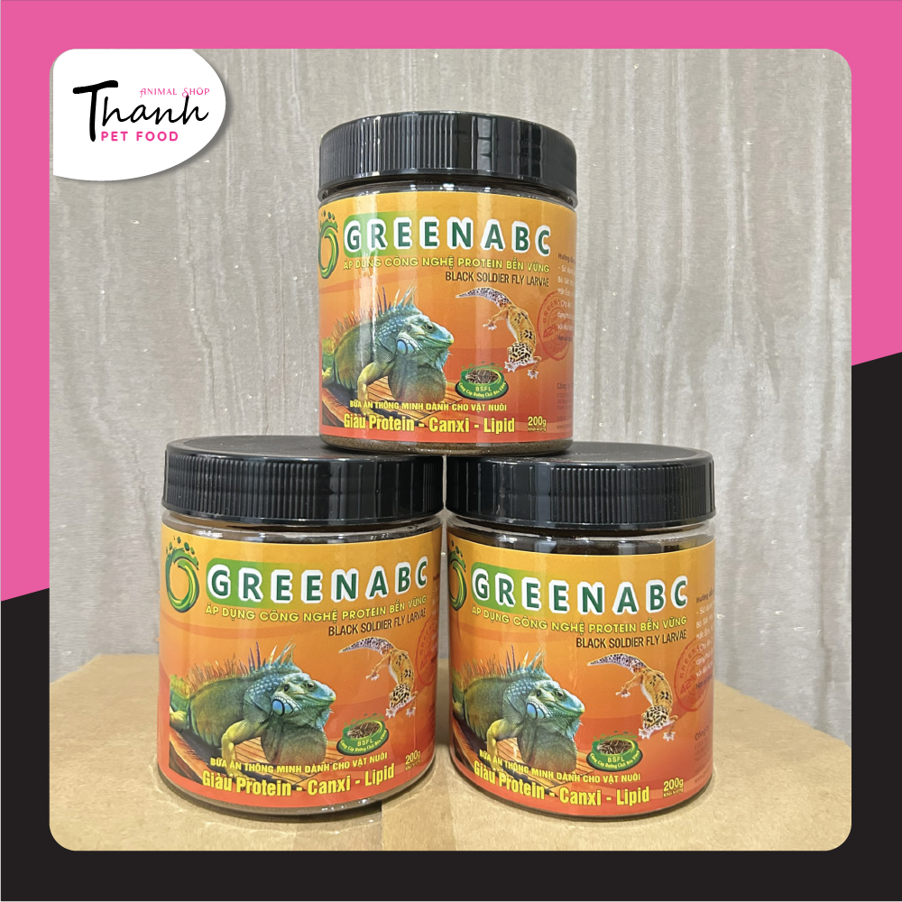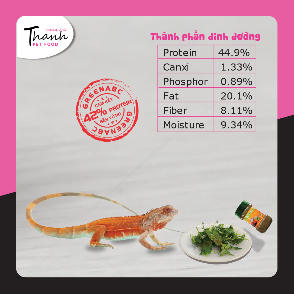 THỨC ĂN BÒ SÁT - BỔ SUNG DINH DƯỠNG PROTEIN, CANXI, LIPID GREENABC là thức ăn cao cấp dành cho các loại bò sát: IGUANA, BEARDED DRAGON, LEOPARD GECKO. Đặc biệt sản phẩm GREENABC được