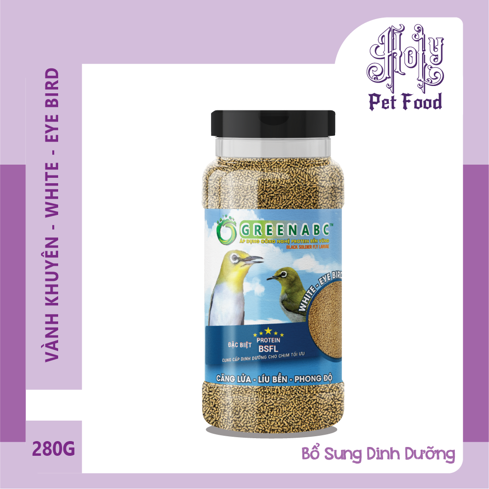 GREENABC - THỨC ĂN CHIM VÀNH KHUYÊN HÀNG NGÀY & BỔ SUNG GREENABC là thức ăn cao cấp dành cho CHIM VÀNH KHUYÊN. Đặc biệt sản phẩm GREENABC được sản xuất theo phương pháp Áp dụng công nghệ PROTEIN bền vững từ bột đạm rất giàu PROTEIN – CANXI – LIPID có trong BSFL, đã được Mỹ (AAFCO) và EU chấp nhận đưa vào công thức cho ngành sản xuất thức ăn cho vật nuôi. Sản phẩm GREENABC cung cấp các giá trị dinh dưỡng bền vững cho thú cưng, giúp cho chim:     + Kích thích vị giác, chim ăn ngon miệng hơn.     + Tiêu hóa tốt, tăng cường hấp thụ các dưỡng chất.     + Cơ thể khỏe mạnh, cân đối săn chắc, căng lửa bền lâu.     + Lông óng mượt, tăng màu sắc rực rỡ.     + Tăng cường miễn dịch, chống lại các bệnh thường gặp. Đặc biệt với thành phần G.Meal đầy đủ các dưỡng chất cần thiết giúp cơ thể phát triển toàn diện.