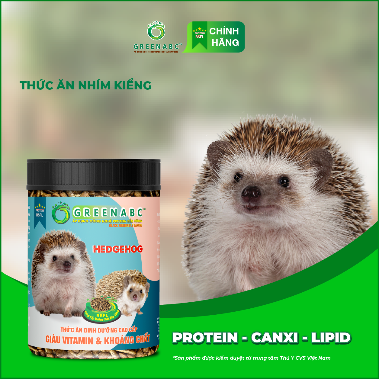 GREENABC - THỨC ĂN NHÍM KIỂNG GREENABC là thức ăn cao cấp dành cho NHÍM KIỂNG. Đặc biệt sản phẩm GREENABC được sản xuất theo phương pháp Áp dụng công nghệ PROTEIN bền vững rất giàu PROTEIN – CANXI – LIPID có trong BSFL, đã được Mỹ (AAFCO) và EU chấp nhận đưa vào công thức cho ngành sản xuất thức ăn cho vật nuôi. Sản phẩm GREENABC cung cấp các giá trị dinh dưỡng bền vững cho thú cưng, giúp cho Nhím Kiểng: