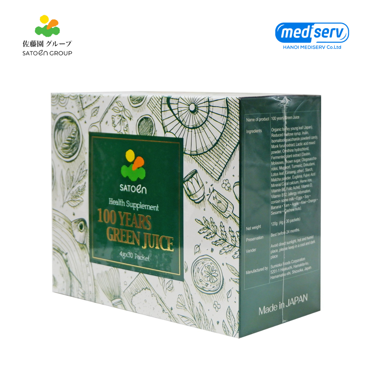 Tên sản phẩm: Thực phẩm bảo vệ sức khỏe – 100 YEARS GREEN JUICE BỔ SUNG CÁC VITAMIN, KHOÁNG CHẤT VÀ CHẤT XƠ CHO CƠ THỂ. BỔ SUNG LỢI KHUẨN, HỖ TRỢ TĂNG CƯỜNG TIÊU