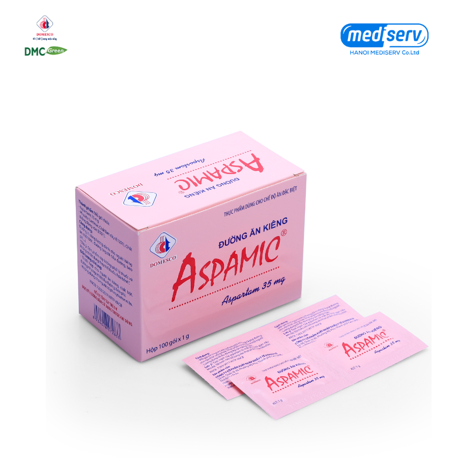 Thực phẩm dùng cho chế độ ăn đặc biệt: Đường ăn kiêng Aspamic Thành phần: Mỗi gói chứa: – Aspartame: 35 mg – Phụ liệu: Lactose, Chất làm dày (E1201), Chất chống đông vón (E551).