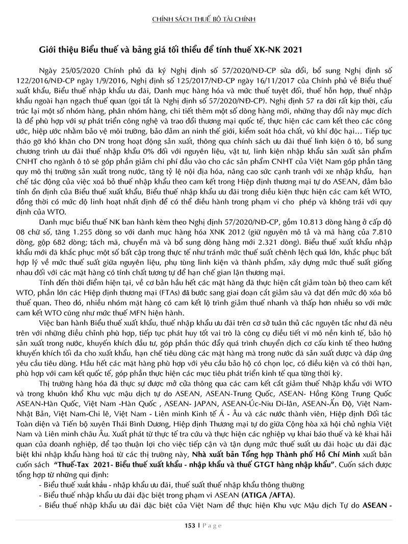 THUẾ - TAX 2021 (song ngữ Anh việt) BIỂU THUẾ XUẤT KHẨU – NHẬP KHẨU VÀ THUẾ GTGT HÀNG NHẬP KHẨU 24 cột bao gồm: mã số, Danh mục biểu thuế hài hòa ASEAN PHIÊN BẢN 2017, MFN/WTO, ATIGA, ACFTA, AHKFTA, AKFTA, VKFTA, AANZFTA, AIFTA, VCFTA, AJCEP, VJEPA, VN- EAEU FTA, CPTPP, EVFTA, VAT được tổng hợp thống nhất trong cùng 1 bảng biểu. Bảng giá tối thiểu để tính thuế hàng hóa xuất khẩu – nhập khẩu. Giới thiệu Biểu thuế và bảng giá tối thiểu để tính thuế XK-NK 2021 Ngày 25/05/2020 Chính phủ đã ký Nghị định số 57/2020/NĐ-CP sửa đổi, bổ sung Nghị định số 122/2016/NĐ-CP ngày 1/9/2016, Nghị định số 125/2017/NĐ-CP ngày 16/11/2017 của Chính phủ về Biểu thuế xuất khẩu, Biểu thuế nhập khẩu ưu đãi, Danh mục hàng hóa và mức thuế tuyệt đối, thuế hỗn hợp, thuế nhập khẩu ngoài hạn ngạch thuế quan (gọi tắt là Nghị định số 57/2020/NĐ-CP). Nghị định 57 ra đời rất kịp thời, cấu trúc lại một số nhóm hàng, phân nhóm hàng, chi tiết thêm một số dòng hàng mới, những thay đổi này mục đích là để phù hợp với sự phát triển công nghệ và trao đổi thương mại quốc tế, thực hiện các cam kết theo các công ước, hiệp ước nhằm bảo vệ môi trường, bảo đảm an ninh thế giới, kiểm soát hóa chất, vũ khí độc hại… Tiếp tục tháo gỡ khó khăn cho DN trong hoạt động sản xuất, thông qua chính sách ưu đãi thuế linh kiện ô tô, bổ sung chương trình ưu đãi thuế nhập khẩu 0% đối với nguyên liệu, vật tư, linh kiện nhập khẩu sản xuất sản phẩm CNHT cho ngành ô tô sẽ góp phần giảm chi phí đầu vào cho các sản phẩm CNHT của Việt Nam góp phần tăng quy mô thị trường sản xuất trong nước, tăng tỷ lệ nội địa hóa, nâng cao sức cạnh tranh với xe nhập khẩu, hạn chế tác động của việc xoá bỏ thuế nhập khẩu theo cam kết trong Hiệp định thương mại tự do ASEAN, đảm bảo tính ổn định của Biểu thuế xuất khẩu, Biểu thuế nhập khẩu ưu đãi trong điều kiện thực hiện các cam kết WTO, đồng thời có mức độ linh hoạt nhất định để có thể điều hành trong phạm vi cho phép và không trái với quy định của WTO. Danh mục biểu thuế NK ban hành kèm theo Nghị định 57/2020/NĐ-CP, gồm 10.813 dòng hàng ở cấp độ 08 chữ số, tăng 1.255 dòng so với danh mục hàng hóa XNK 2012 (giữ nguyên mô tả và mã hàng của 7.810 dòng, gộp 682 dòng; tách mã, chuyển mã và bổ sung dòng hàng mới 2.321 dòng). Biểu thuế xuất khẩu nhập khẩu mới đã khắc phục một số bất cập trong thực tế như tránh mức thuế suất chênh lệch quá lớn, khắc phục bất hợp lý về mức thuế suất giữa nguyên liệu, phụ tùng linh kiện và thành phẩm, xây dựng mức thuế suất giống nhau đối với các mặt hàng có tính chất tương tự để hạn chế gian lận thương mại. Tính đến thời điểm hiện tại, về cơ bản hầu hết các mặt hàng đã thực hiện cắt giảm toàn bộ theo cam kết WTO, phần lớn các Hiệp định thương mại (FTAs) đã bước sang giai đoạn cắt giảm sâu và đạt đến mức độ xóa bỏ thuế quan. Theo đó, nhiều nhóm mặt hàng có cam kết lộ trình giảm thuế nhanh và thấp hơn nhiều so với mức cam kết WTO cũng như mức thuế MFN hiện hành. Việc ban hành Biểu thuế xuất khẩu, thuế nhập khẩu ưu đãi trên cơ sở tuân thủ các nguyên tắc như đã nêu trên với những điều chỉnh phù hợp, tiếp tục phát huy tốt vai trò là công cụ điều tiết vĩ mô nền kinh tế, bảo hộ sản xuất trong nước, khuyến khích đầu tư, góp phần thúc đẩy quá trình chuyển dịch cơ cấu kinh tế theo hướng khuyến khích tối đa cho xuất khẩu, hạn chế tiêu dùng các mặt hàng mà trong nước đã sản xuất được và đáp ứng yêu cầu tiêu dùng. Hầu hết các mặt hàng phù hợp với yêu cầu bảo hộ có chọn lọc, có điều kiện và có thời hạn, phù hợp với cam kết quốc tế, góp phần thực hiện các mục tiêu phát triển kinh tế qua từng thời kỳ. Thị trường hàng hóa đã thực sự được mở cửa thông qua các cam kết cắt giảm thuế Nhập khẩu với WTO và trong khuôn khổ Khu vực mậu dịch tự do ASEAN, ASEAN-Trung Quốc, ASEAN- Hồng Kông Trung Quốc ASEAN-Hàn Quốc, Việt Nam -Hàn Quốc , ASEAN- JAPAN, ASEAN-Úc-Niu Di-lân, ASEAN-Ấn Độ, Việt NamNhật Bản, Việt Nam-Chi lê, Việt Nam - Liên minh Kinh tế Á - Âu và các nước thành viên, Hiệp định Đối tác Toàn diện và Tiến bộ xuyên Thái Bình Dương, Hiệp định Thương mại tự do giữa Cộng hòa xã hội chủ nghĩa Việt Nam và Liên minh châu Âu. Xuất phát từ thực tế tra cứu và thực hiện các nghiệp vụ khai báo thuế và kê khai hải quan của doanh nghiệp, để tạo thuận lợi cho việc tiếp cận và tận dụng mức thuế suất ưu đãi hoặc ưu đãi đặc biệt khi nhập khẩu hàng hoá từ các thị trường này, Nhà xuất bản Tổng hợp Thành phố Hồ Chí Minh xuất bản cuốn sách “Thuế-Tax 2021- Biểu thuế xuất khẩu - nhập khẩu và thuế GTGT hàng nhập khẩu”. Cuốn sách được tổng hợp từ những qui định: