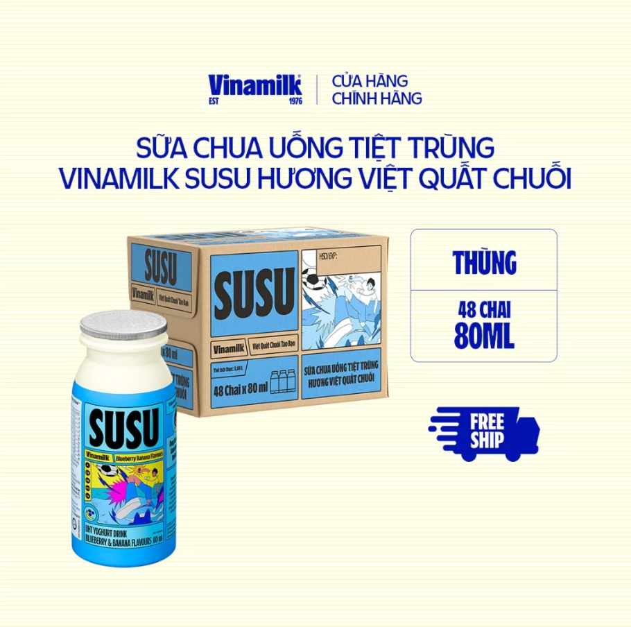 Để đảm bảo chất lượng sản phẩm tốt nhất, các đơn hàng bao gồm kem, sữa chua ăn và sữa chua uống sẽ chỉ được giao trong bán kính 10km từ cửa hàng Vinamilk gần nhất. Đơn hàng của bạn có thể sẽ được hủy nếu không có cửa hàng Vinamilk trong vòng bán kính 10km từ địa chỉ nhận hàng. Sữa chua uống Vinamilk SuSu mới – công thức đột phá Vitamin A giúp bé mắt sáng tinh anh, ngoài ra còn có Vitamin B6, B12 và chất xơ hòa tan giúp bé khỏe mạnh và năng động mỗi ngày. Sữa Chua uống Vinamilk SuSu – Sáng trí tinh anh Bao bì thay đổi tùy theo đợt nhập hàng