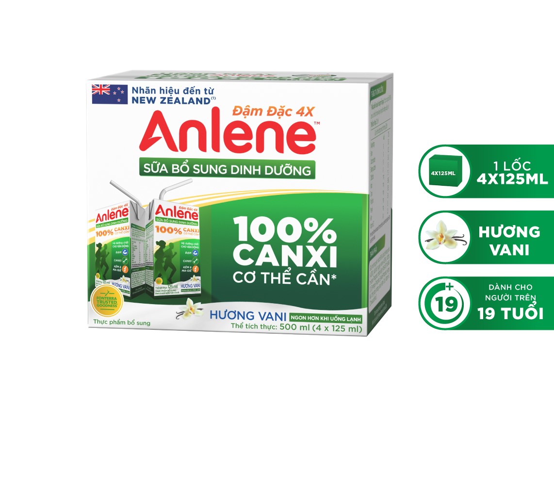 - Sữa Anlene Đậm Đặc 4X với công thức đột phá bổ sung Canxi, và có Vitamin D đóng vai trò là chất xúc tác, giúp xương dung nạp lượng Canxi đã cung cấp cho cơ thể.