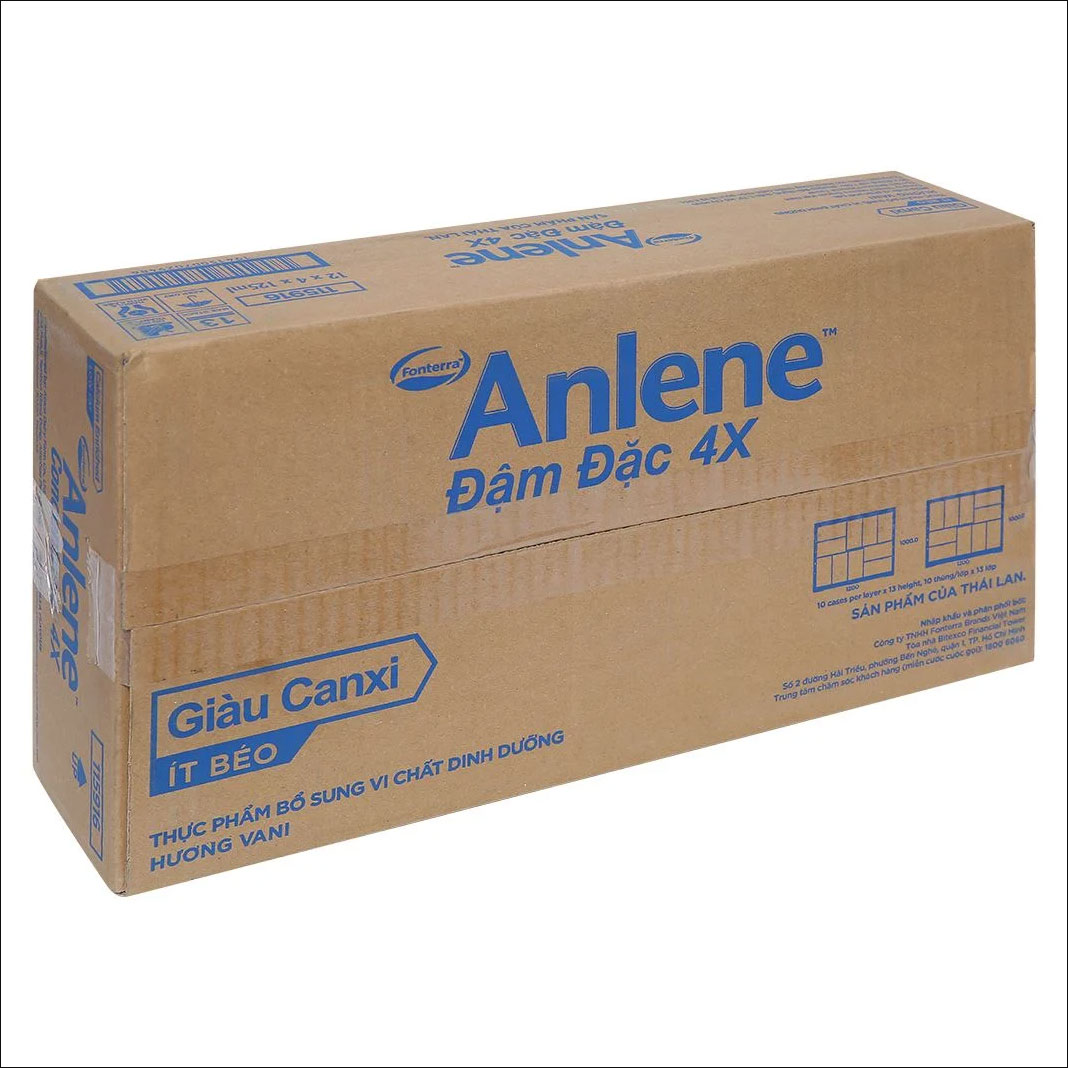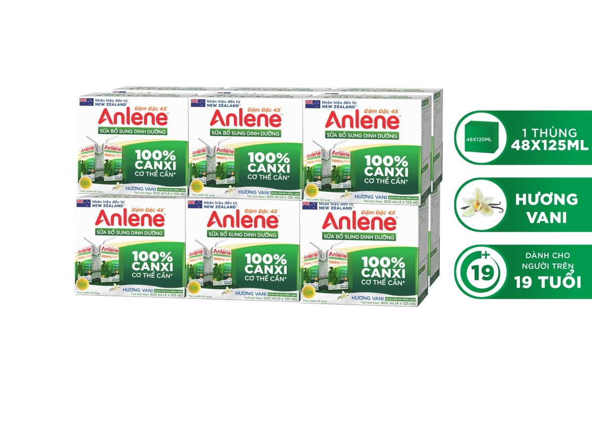 - Thùng 48 Hộp Sữa Anlene Đậm Đặc 4X Ít Béo Hương Vani (12 x 4 x 125 ml) cung cấp các dưỡng chất như: chất đạm sữa chất lượng cao, có chứa các acid amin thiết yếu cho xương các khoáng chất như Canxi, Phốt Pho, Magie, Kẽm, các vitamin như A, C, D3 và các vitamin nhóm B.