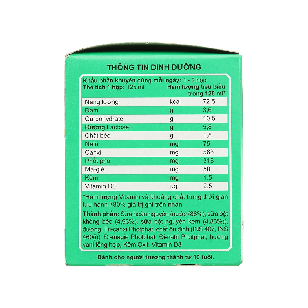 - Thiết kế dạng hộp nhỏ gọn tiện dụng cho bạn dễ dàng mang theo bất kì đâu và mức giá vô cùng hợp lý. Thành phần dinh dưỡng của sản phẩm Sữa bột pha sẵn Anlene hương Vani có thành phần chính bao gồm: Nước, sữa bột nguyên kem, đường, sữa bột không béo, hương vani tổng hợp,... Ngoài ra, sản phẩm cung cấp cho cơ thể khoảng 68 kcal trong 1 hộp sữa 125ml. Thành phần chi tiết Nước, sữa bột không béo (4.9%), sữa bột nguyên kem (4.8%), đường, tri-canxi photphat, phoscal, chất ổn định (cellulose gel INS460(i), cellulose gum INS466, carrageenan INS407), di-magie photphat, disodium photphat, hương vani tổng hợp, kẽm oxit, vitamin D3. Tác dụng của sản phẩm với sức khỏe Anlene Đậm đặc 4X với công thức cải tiến mới giúp xương bạn luôn chắc khỏe để tận hưởng cuộc sống năng động. Hương thơm vani thơm ngon, dễ dùng, giúp người dùng hấp thụ tối đa dinh dưỡng từ sản phẩm. Đối tượng Sản phẩm thích hợp cho mọi người từ 19 tuổi trở lên dùng bổ sung dinh dưỡng hàng ngày. Hướng dẫn sử dụng