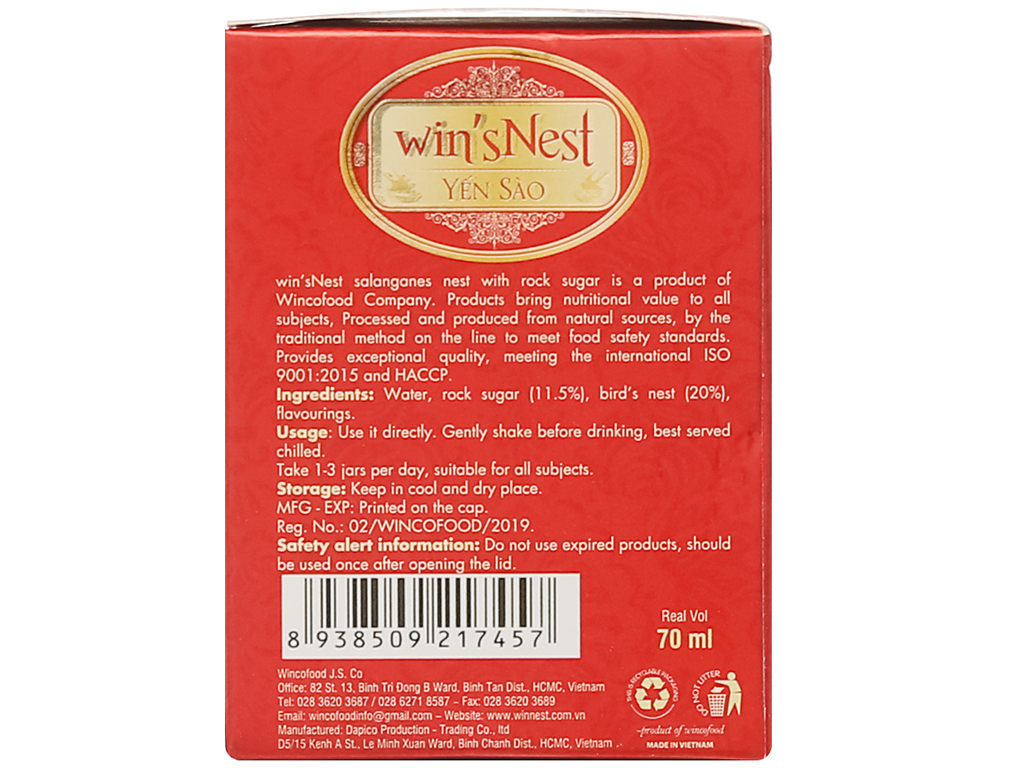 Yến sào cao cấp win'sNest tổ yến chưng sẵn đường phèn được sản xuất từ nguồn yến đảo thiên nhiên, là một sản phẩm của công ty wincofood. Được sản xuất bằng phương pháp cổ truyền trên dây chuyền đạt tiểu chuẩn an toàn thực phẩm.