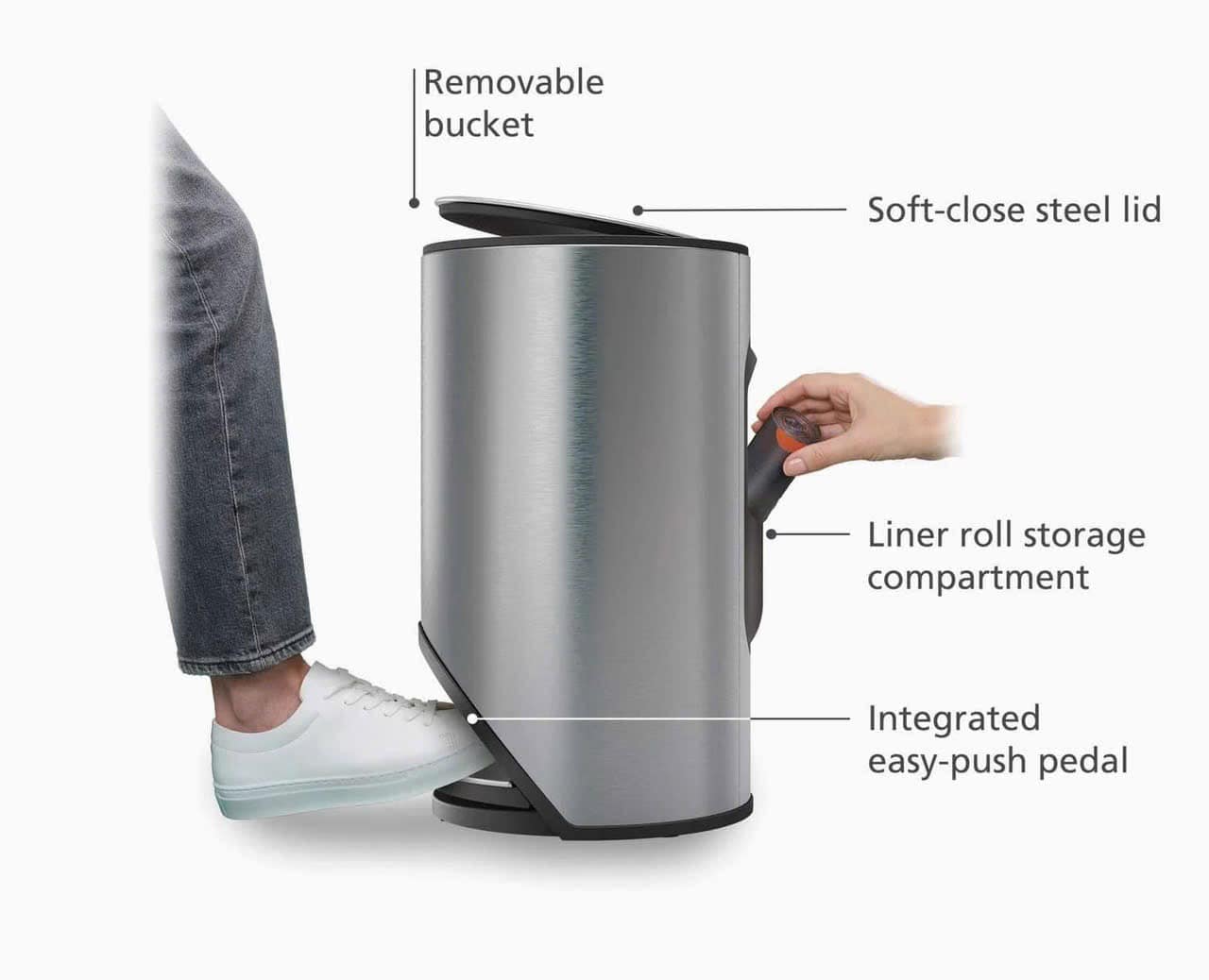 Hình dạng mỏng và bản lề vô hình của thùng rác này làm cho nó hoàn hảo trong không gian chật hẹp. Khe đựng túi nilong tích hợp bên trong giúp việc thay túi nilong
