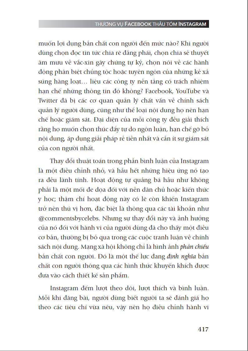 Với những “tình tiết chưa từng được tiết lộ” từ các nguồn tin độc quyền - trong đó có các nhà sáng lập, nhân viên, giám đốc điều hành và cả người nổi tiếng - cuốn sách này đã cho thấy sức tác động to lớn của I đối với xã hội, mối quan hệ đầy rủi ro giữa chúng ta với công nghệ, cuộc chiến khốc liệt giữa các công ty trong việc tranh giành sự chú ý của người dùng cũng như tham vọng thống trị đáng sợ của F