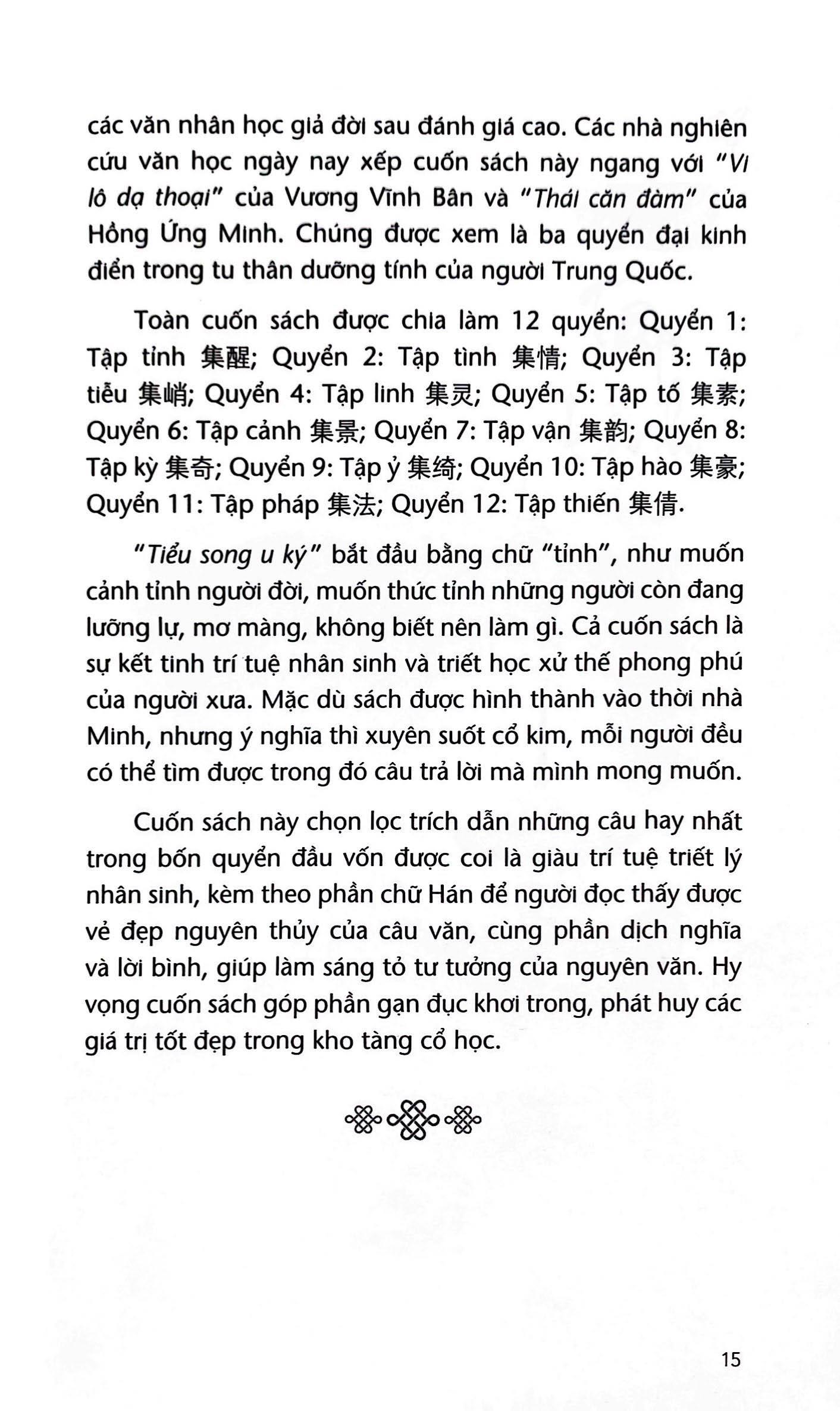 Tiểu song u ký” gồm 12 quyển, là tập tùy bút do Trần Kế Nho thời nhà Minh biên soạn. Cả cuốn sách thoạt trông như một bản ghi chép những điều tai nghe mắt thấy và suy nghĩ của tác giả, nhưng thực chất là những điều tác giả cảm và ngộ. Cảm về một nhân sinh muôn hình vạn trạng, và ngộ về một tấm chân tình của thế gian, một “chân đế” của cuộc sống. Trong cuộc sống hối hả ngày nay, việc đọc cuốn sách Triết lý nhân sinh trong xử thế Tam đại kỳ thư là sự nghỉ ngơi thư giãn, ví như uống một tách trà thơm trên bàn trà tâm hồn, thưởng thức hương hoa lan thoảng đưa trong cơn gió nhẹ.