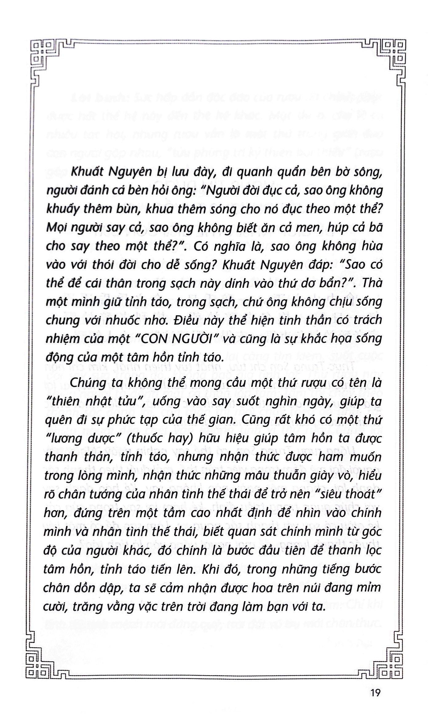 Cuốn sách này chọn lọc trích dẫn những câu hay nhất trong bốn quyển đầu vốn được coi là giàu trí tuệ triết lý nhân sinh, kèm theo phần chữ Hán để người đọc thấy được vẻ đẹp nguyên thủy của câu văn, cùng phần dịch nghĩa và lời bình, giúp làm sáng tỏ tư tưởng của nguyên văn. Hy vọng cuốn sách sẽ góp phần gạn đục khơi trong, phát huy các giá trị tốt đẹp trong kho tàng cổ học