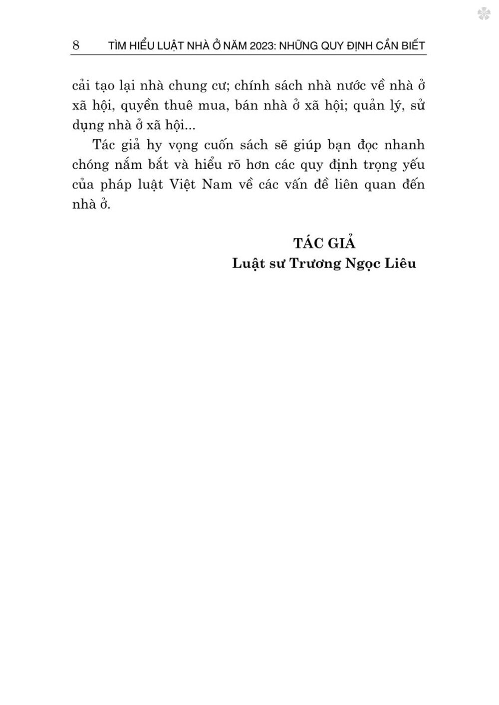 Nhằm kịp thời phục vụ nhu cầu của bạn đọc, Nhà xuất bản Chính trị quốc gia Sự thật xuất bản cuốn sách Tìm hiểu Luật Nhà ở năm 2023: Những quy định cần biết do Luật sư Trương Ngọc Liêu biên soạn. Cuốn sách gồm 07 chương: Chương I: Những nội dung cơ bản. Chương II: Quyền sở hữu nhà ở tại Việt Nam của tổ chức, cá nhân nước ngoài. Chương III: Phát triển nhà ở. Chương IV: Chính sách về nhà ở xã hội. Chương V: Cải tạo, xây dựng lại nhà chung cư. Chương VI: Quản lý, sử dụng nhà chung cư. Chương VII: Giao dịch về nhà ở. Xin trân trọng giới thiệu cuốn sách và mong nhận được ý kiến góp ý của bạn đọc.