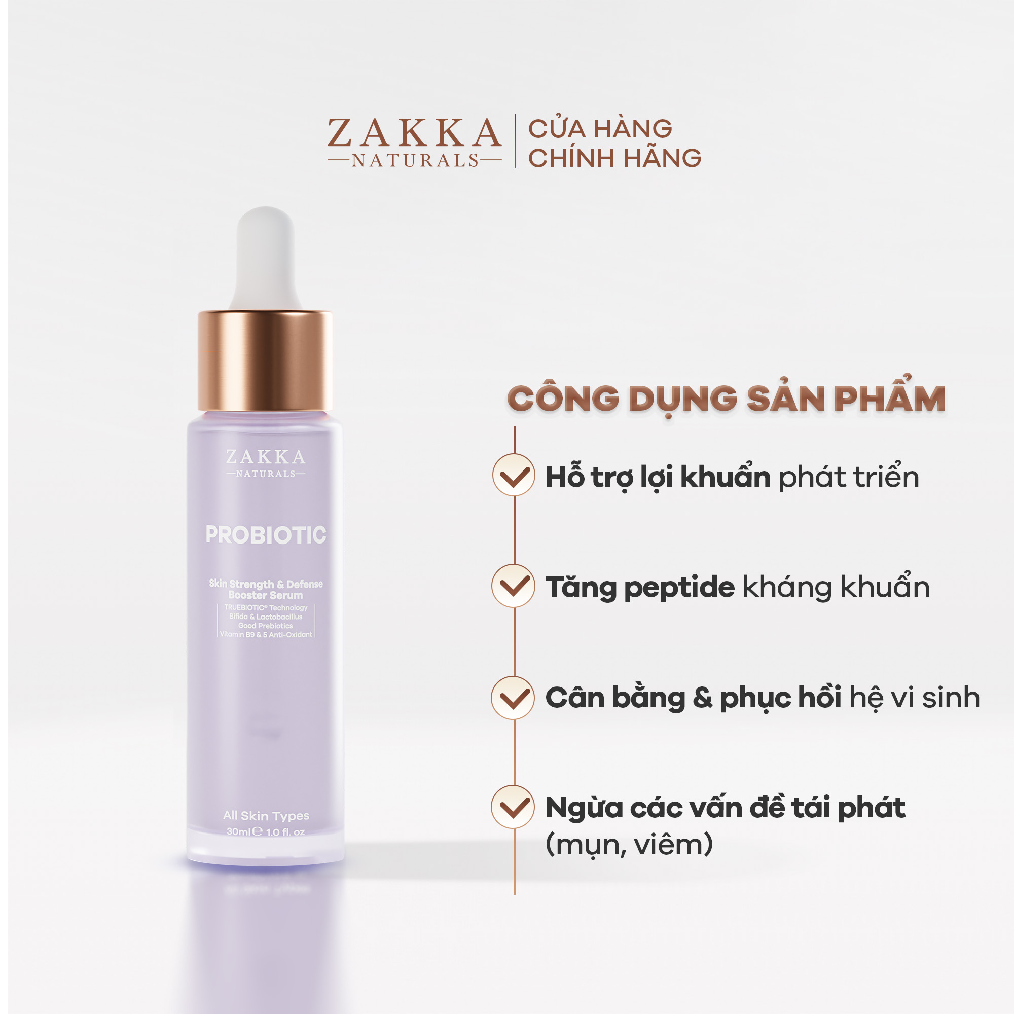 Tinh chất tăng cường miễn dịch và sức khoẻ cho da với công nghệ TRUEBIOTIC được Zakka Naturals - local brand đầu tiên ứng dụng tại Việt Nam giúp bảo tồn trọn vẹn hình thái khuẩn Lactobacillus. Sự kết hợp của Bifida & Lactobacillus, Good Prebiotics và Vitamin B9 cùng 5 chiết xuất hạn chế oxy hóa giúp cung cấp môi trường sống tối ưu cho quá trình cân bằng hệ vi sinh trên da. Từ đó, tăng cường sức đề kháng của da trước các tác nhân gây hại bên ngoài, hỗ trợ ổn định và ngừa tái phát các vấn đề da, giảm căng thẳng da, giải quyết tình trạng kích ứng, mẩn đỏ, ngứa rát do thay đổi môi trường.