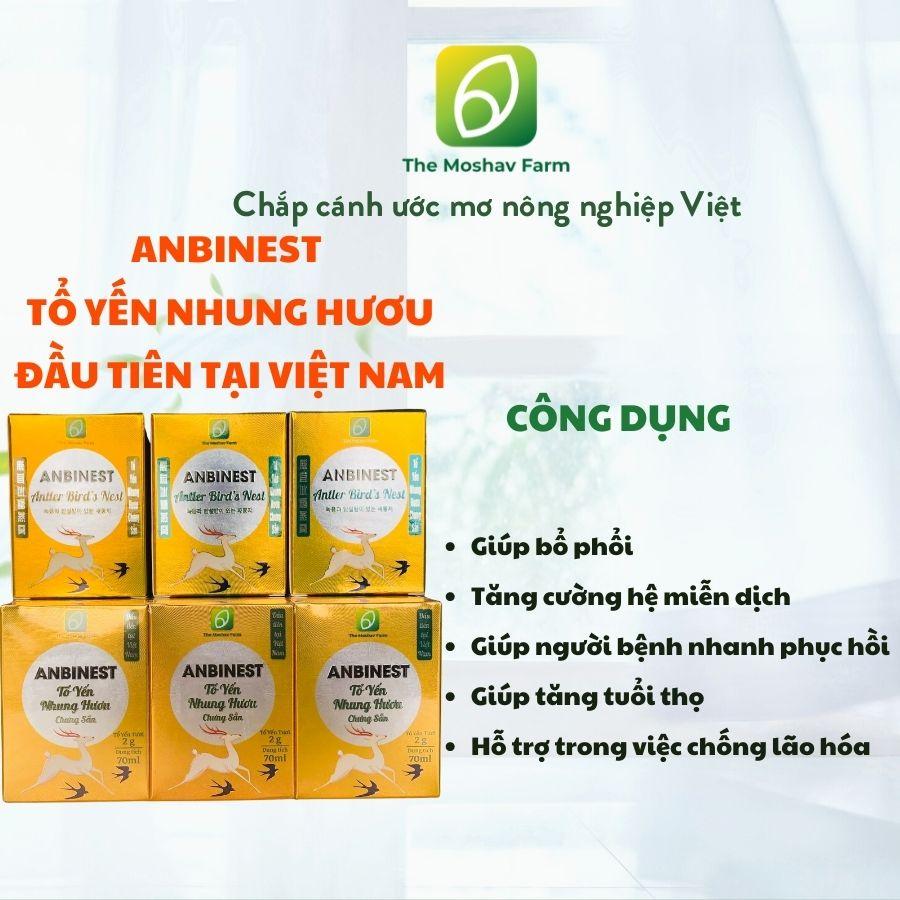 1. Tên sản phẩm: Tổ Yến Nhung Hươu Chưng Sẵn- ANBINEST Quy cách đóng gói: Khay quả 6 hũ,có kèm thiệp lời chúc. - Thể tích thực: 70ml - Hạn sử dụng: 24 tháng -