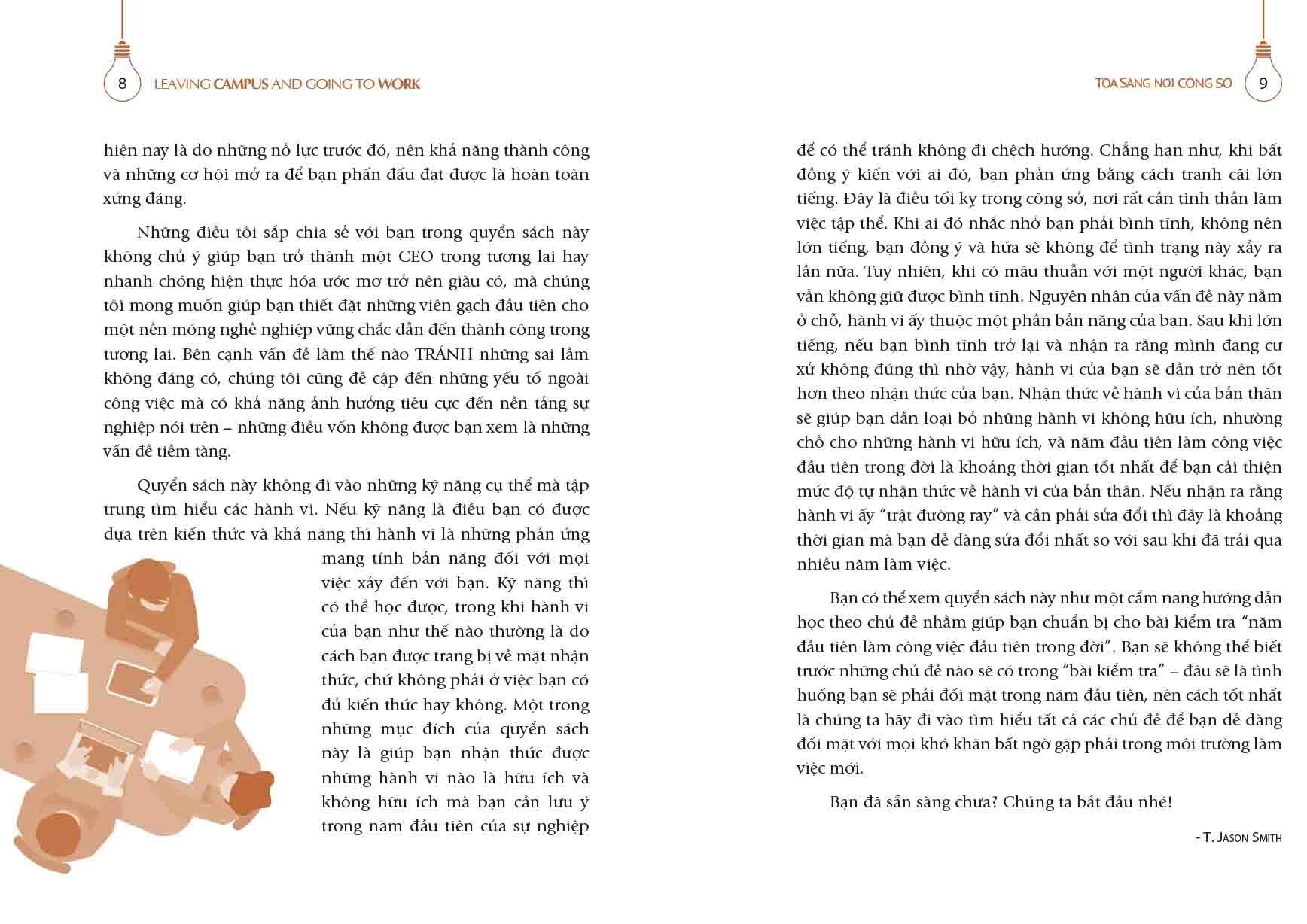 Mỗi chúng ta đều ít nhiều mắc sai lầm và thường cảm thấy hối tiếc. Tuy nhiên trong môi trường làm việc chuyên nghiệp, bạn sẽ không có nhiều cơ hội để phạm sai lầm, nhất là những sai lầm khiến người khác có thành kiến về bạn. Khi quan sát những người trẻ cố gắng tự thân vận động trong năm đầu tiên làm việc và phạm phải nhiều sai lầm đáng tiếc ngăn cản họ tiến lên trong sự nghiệp, chuyên gia quản lý T. Jason Smith đã tự hỏi: “Mình có thể làm gì để sinh viên mới ra trường được tuyển dụng nhanh chóng hòa nhập với môi trường công việc?”. Chính trăn trở đó đã thôi thúc ông viết nên quyển sách “Tỏa Sáng Nơi Công Sở”.