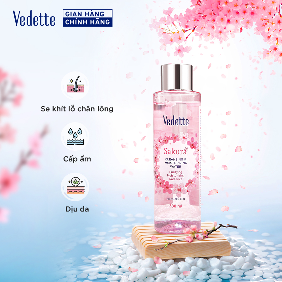 - Bước tiếp theo: kem dưỡng hoặc mặt nạ dưỡng ẩm THÀNH PHẦN Water, Aloe Barbadensis Leaf Juice, Phenoxyethanol, Disodium EDTA, Chlorphenesin, Fragrance (Sakura Blossom), PEG-40 Hydrogenated Castor Oil BẢO QUẢN: Bảo quản nơi khô ráo, thoáng mát, tránh ánh nắng trực tiếp, giữ xa tầm tay trẻ em. HSD: 3 năm kể từ ngày sản xuất. THƯƠNG HIỆU: VEDETTE XUẤT XỨ: Việt Nam
