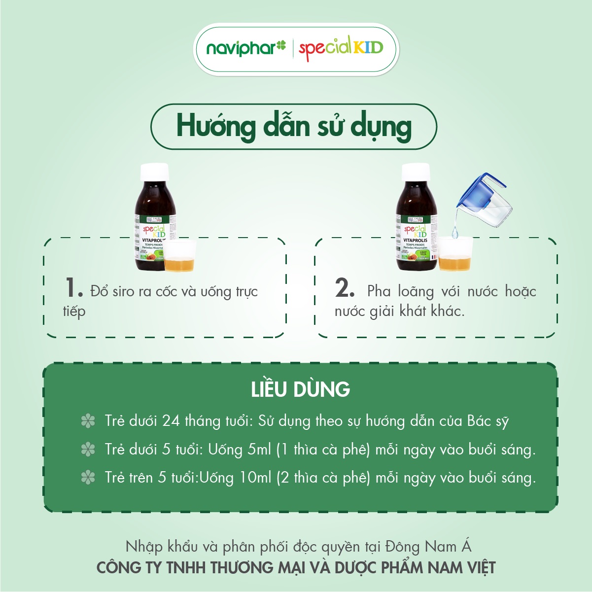 Trẻ dưới 5 tuổi : Uống 5ml (1 thìa cà phê) mỗi ngày vào buổi sáng.