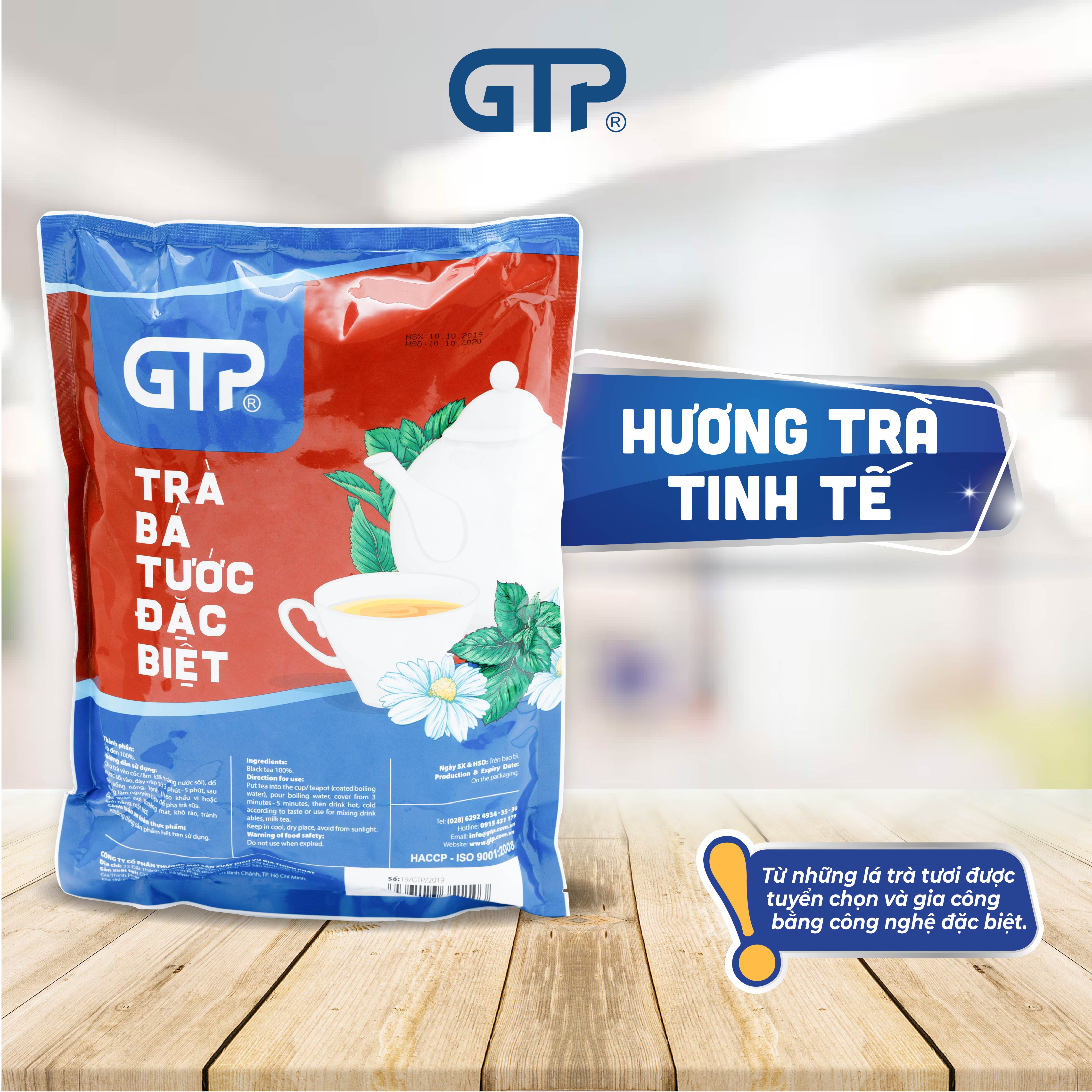 Chứng nhận: Sản xuất tại Việt Nam. 100% chính hãng. Chứng nhận tiêu chuẩn chất lượng quốc tế ISO 22000 : 2018. Mô tả: TRÀ BÁ TƯỚC ĐẶC BIỆT GTP - CHUYÊN DÙNG PHA CHẾ TRÀ SỮA & TRÀ TRÁI CÂY GIẢI KHÁT 100% lá trà tự nhiên, từ nguồn nguyên liệu trà Bảo Lộc, Lâm Đồng, Việt Nam. Hòa quyện tốt, giữ được vị trà đặc trưng khi kết hợp với bột kem béo pha trà sữa. Thiên về độ ngọt, độ đắng chát vừa phải giúp cho ra những ly trà sữa/trà trái cây thơm ngon chuẩn gu Việt. Màu trà sau khi pha có màu đỏ đặc trưng, đẹp mắt.
