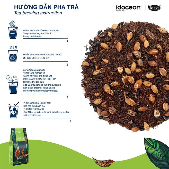 - Hướng dẫn pha trà sữa với Trà Ceylon Cổ Điển LÚAVE Bước 1: Ngâm 1 gói trà với 600ml nước sôi Bước 2: Khuấy đều trong 30 giây và ủ trà trong 15 phút Bước 3: Lấy gói trà ra ngoài, thêm 50g đường và 100g Bột kem béo thực vật MT35 LÚAVE khuấy tan hỗn hợp Bước 4: Thêm 400g đá, khuấy tan, rót trà sữa ra ly đá, thêm trái cây và thưởng thức lạnh.