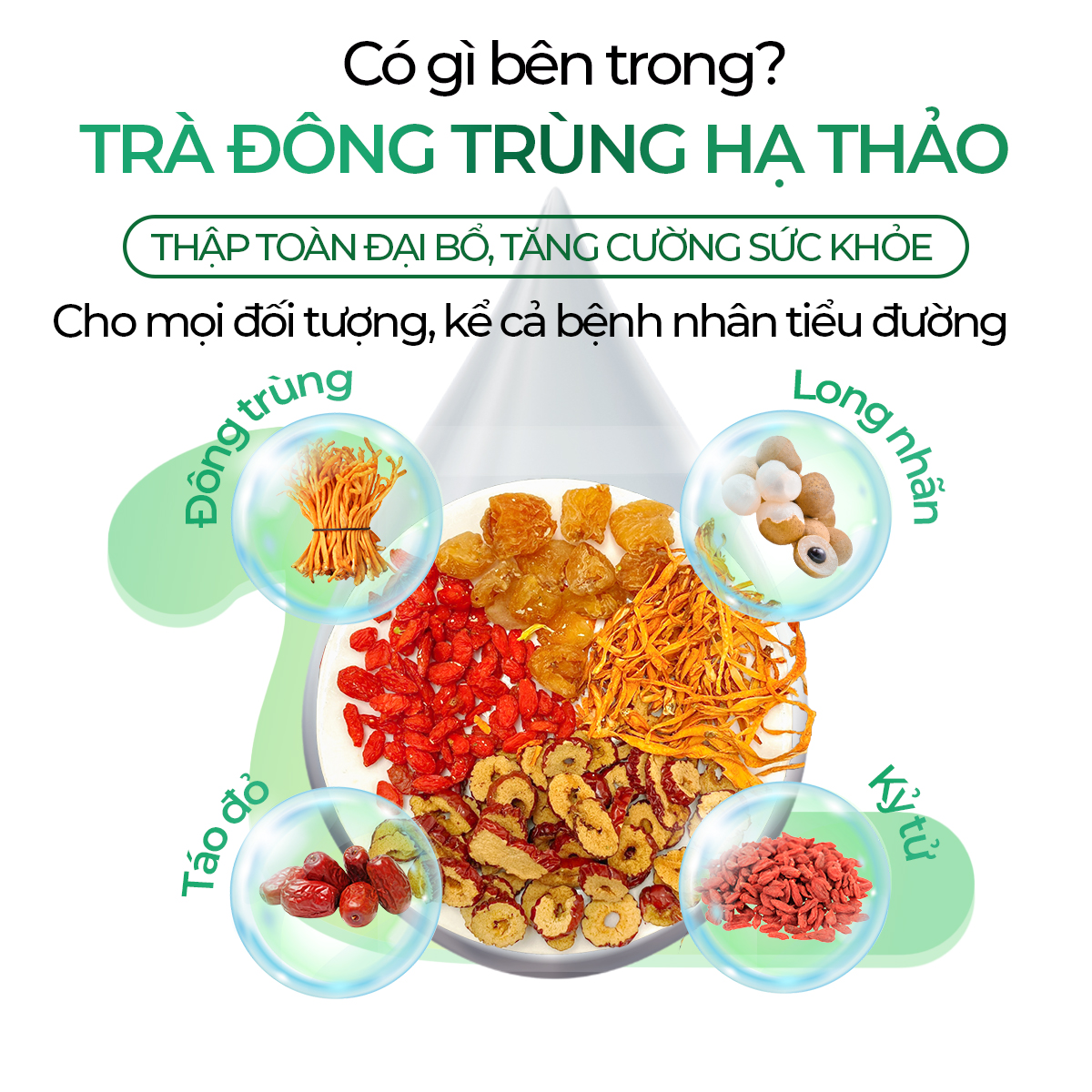 ❖ Thành phần: Nấm Đông Trùng Hạ Thảo; Táo Đỏ; Kỷ Tử; Long Nhãn.