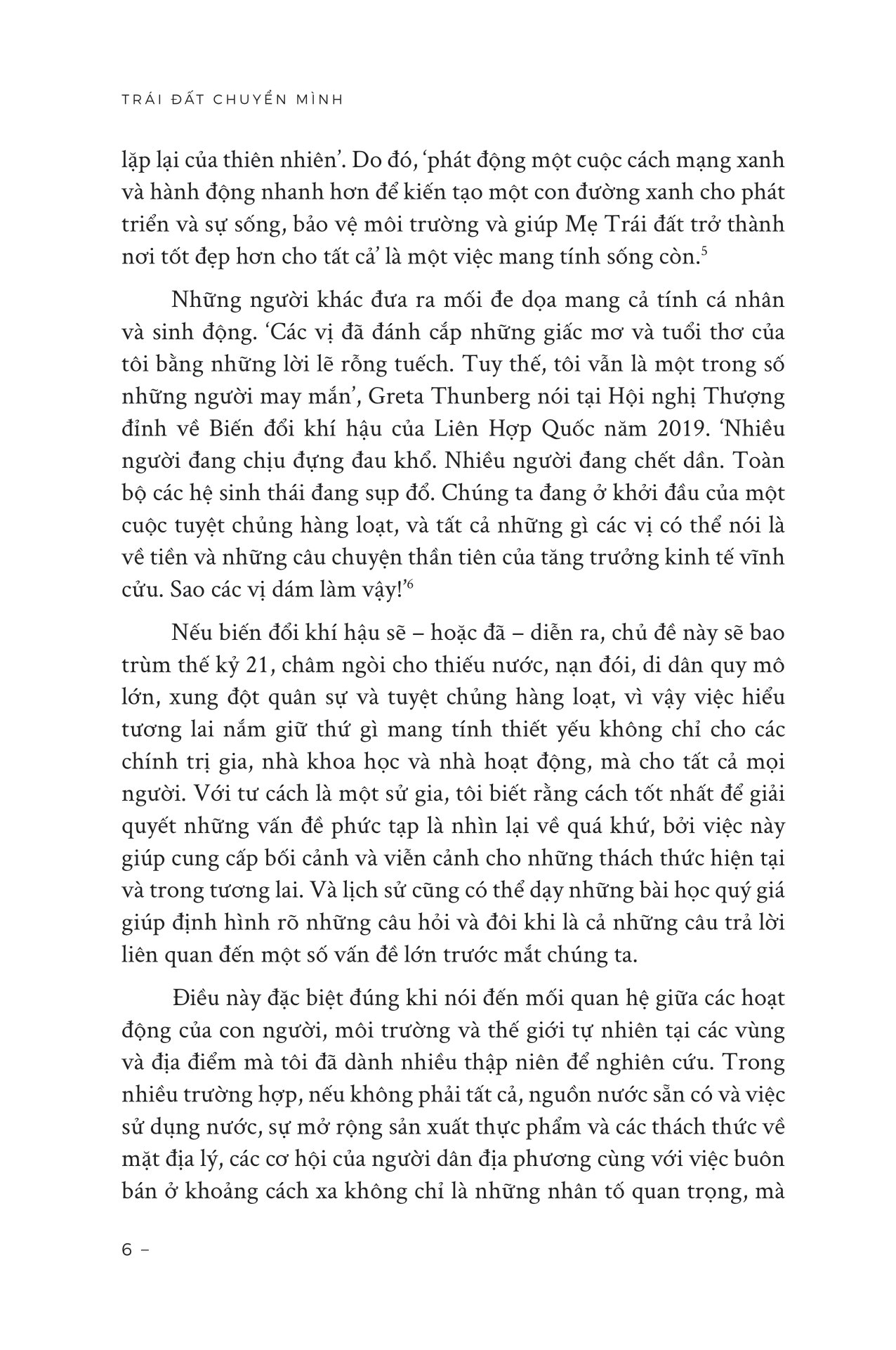 Khi nghĩ về lịch sử, chúng ta hiếm khi chú ý nhiều đến những trận lũ lụt kinh khủng nhất, những mùa đông tồi tệ nhất, những đợt hạn hán tàn khốc nhất hay cách các hệ sinh thái đã thay đổi theo thời gian. Trong “Trái đất chuyển mình”, GS Peter Frankopan đã chỉ ra rằng môi trường tự nhiên là một yếu tố quan trọng, nếu không muốn nói là yếu tố quyết định, trong lịch sử loài người và của cả lịch sử toàn cầu.