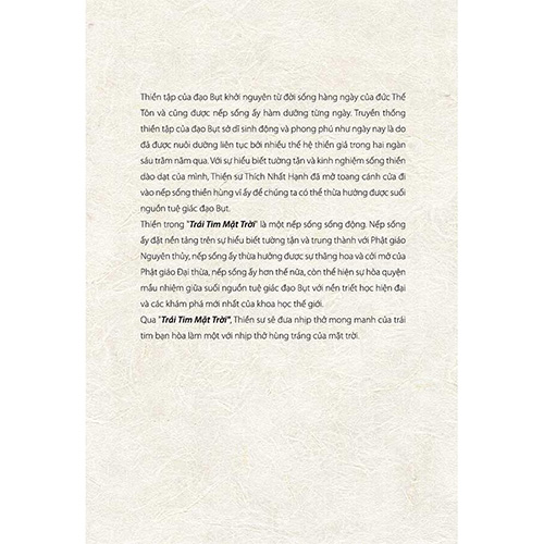 Thiền trong Trái Tim Mặt Trời là một nếp sống sống động. Nếp sống ấy đặt nền tảng trên sự hiểu biết tường tận và trung thành với Phật giáo Nguyên thủy, nếp sống ấy thừa hưởng được sự thăng hoa và cởi mở của Phật giáo Đại thừa, nếp sống ấy hơn thế nữa, còn thể hiện sự hòa quyện mầu nhiệm giữa suối nguồn tuệ giác đạo Bụt với nền triết học hiện đại và các khám phá mới nhất của khoa học thế giới.