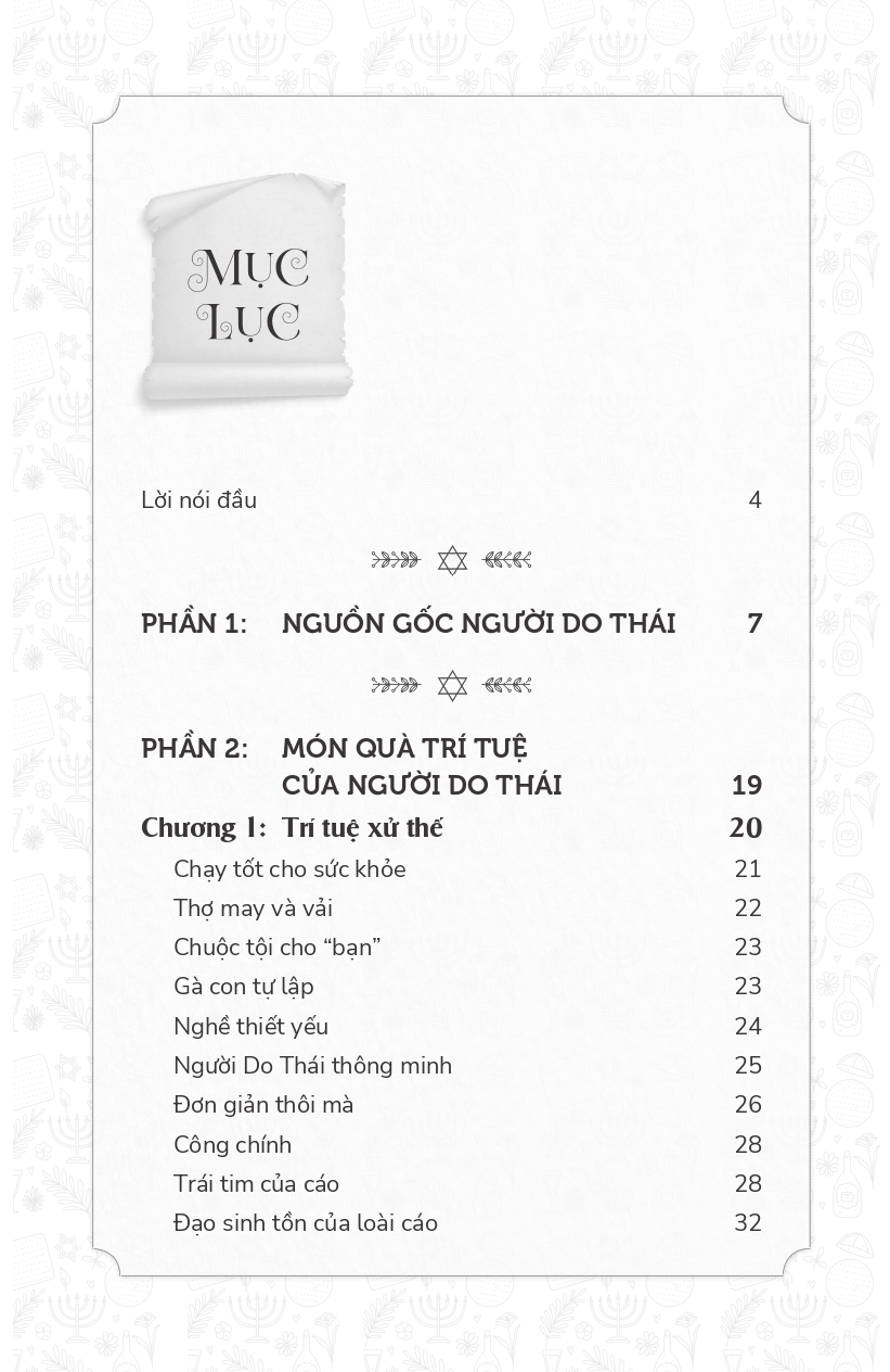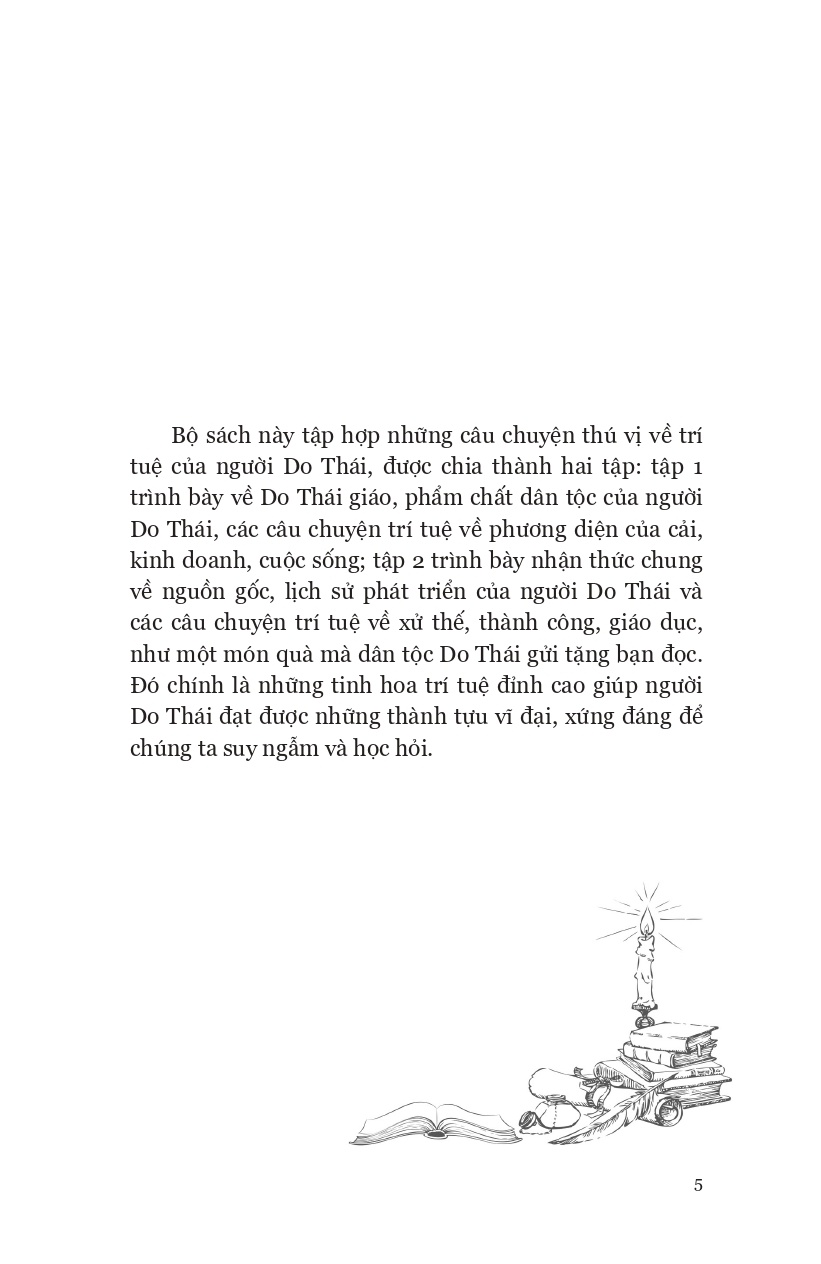 TRÍ TUỆ DO THÁI – THÀNH CÔNG, XỬ THẾ, GIÁO DỤC mang đến cho bạn đọc những nhận thức chung về nguồn gốc, lịch sử phát triển của người Do Thái; cùng với đó là các câu chuyện trí tuệ về xử thế, thành công và giáo dục mà mỗi người Do Thái đều phải học tập từ bé cho đến cuối đời. Sách như một món quà mà dân tộc Do Thái gửi tặng bạn đọc trên khắp thế giới, xứng đáng để chúng ta suy ngẫm và học hỏi.