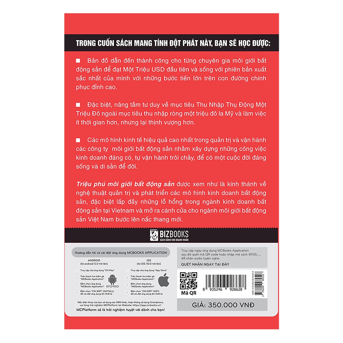 Nghề bất động sản – lựa chọn hoàn hảo cho bất kỳ người nào có máu kinh doanh và nhiều tham vọng Với chi phí khởi nghiệp tương đối thấp và không có mức trần cứng nhắc giới hạn thu nhập, nghề bất động sản dường như là lựa chọn hoàn hảo cho bất kỳ người nào có máu kinh doanh và nhiều tham vọng. Trong ngành này, bạn tự định ra hạn mức cho mình. Cách tiếp cận, khả năng và niềm đam mê môi giới bất động sản sẽ là những nhân tố quyết định lớn nhất cho thành công của bạn. Với “Triệu phú môi giới bất động sản”, bạn sẽ được trả lời câu hỏi quan trọng nhất mà bất kỳ ai làm môi giới bất động sản cũng có thể đã từng tự hỏi mình: “Làm thế nào tôi, với tư cách là người môi giới bất động sản, có thể tăng thu nhập của mình lên đến mức cao nhất có thể?” Trong cuốn sách này, tác giả sẽ trình bày với bạn cách suy nghĩ giống như một Triệu phú môi giới bất động sản. Sau đó, chúng tôi sẽ chỉ cho bạn biết, từng bước một, cách kiếm được một triệu đô la thu nhập ròng mỗi năm. Cuối cùng, chúng tôi sẽ chỉ ra con đường phải đi để nhận được một triệu đô la thu nhập thụ động(1) Triệu phú môi giới bất động sản được xem như là kinh thánh về nghệ thuật quản trị và phát triển các mô hình kinh doanh bất động sản, đặc biệt lấp đầy những lỗ hổng trong ngành kinh doanh bất động sản tại Việt Nam. Trên thế giới cũng như tại Việt Nam, chưa có chuyên gia nào như Gary Keller nói rõ và chi tiết về từng bước xây dựng và tăng trưởng đạt đến những thành công vang dội như vậy trong Triệu phú môi giới bất động sản. Triệu phú môi giới bất động sản được viết riêng cho những người có tinh thần làm việc tận tụy và dám mạo hiểm để trở thành những người tiên phong trong lĩnh vực kinh doanh của mình – sách này dành tặng riêng cho các chuyên gia môi giới bất động sản ở khắp mọi nơi trên thế giới. “Sách Đỏ: của chuyên gia bất động sản khắp nơi trên thế giới Trong cuốn sách mang tính đột phá này, bạn sẽ học được: