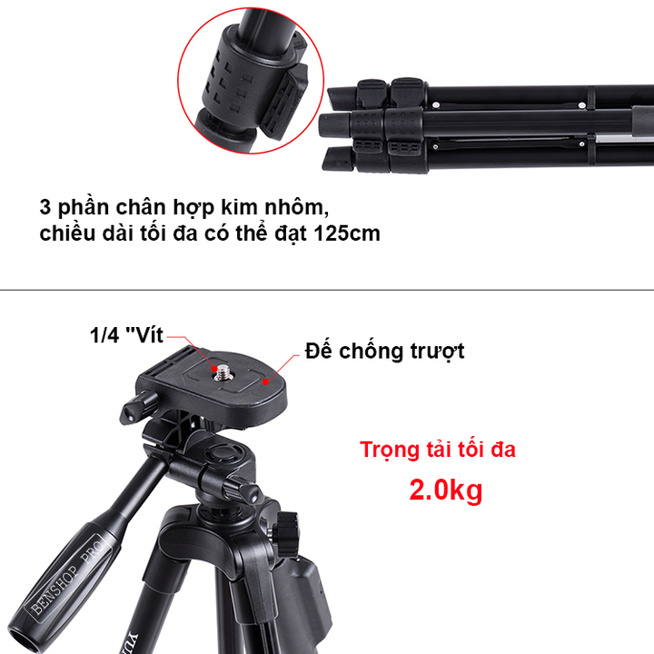 1, Tripod Yunteng VCT-691 - Số đoạn: 3 - Chất liệu: Nhôm + Nhựa ABS - Trọng lượng: Khoảng 1.55kg - Tải trọng tối đa: 3kg - Số lượng chân Số đoạn: 4 - Chân
