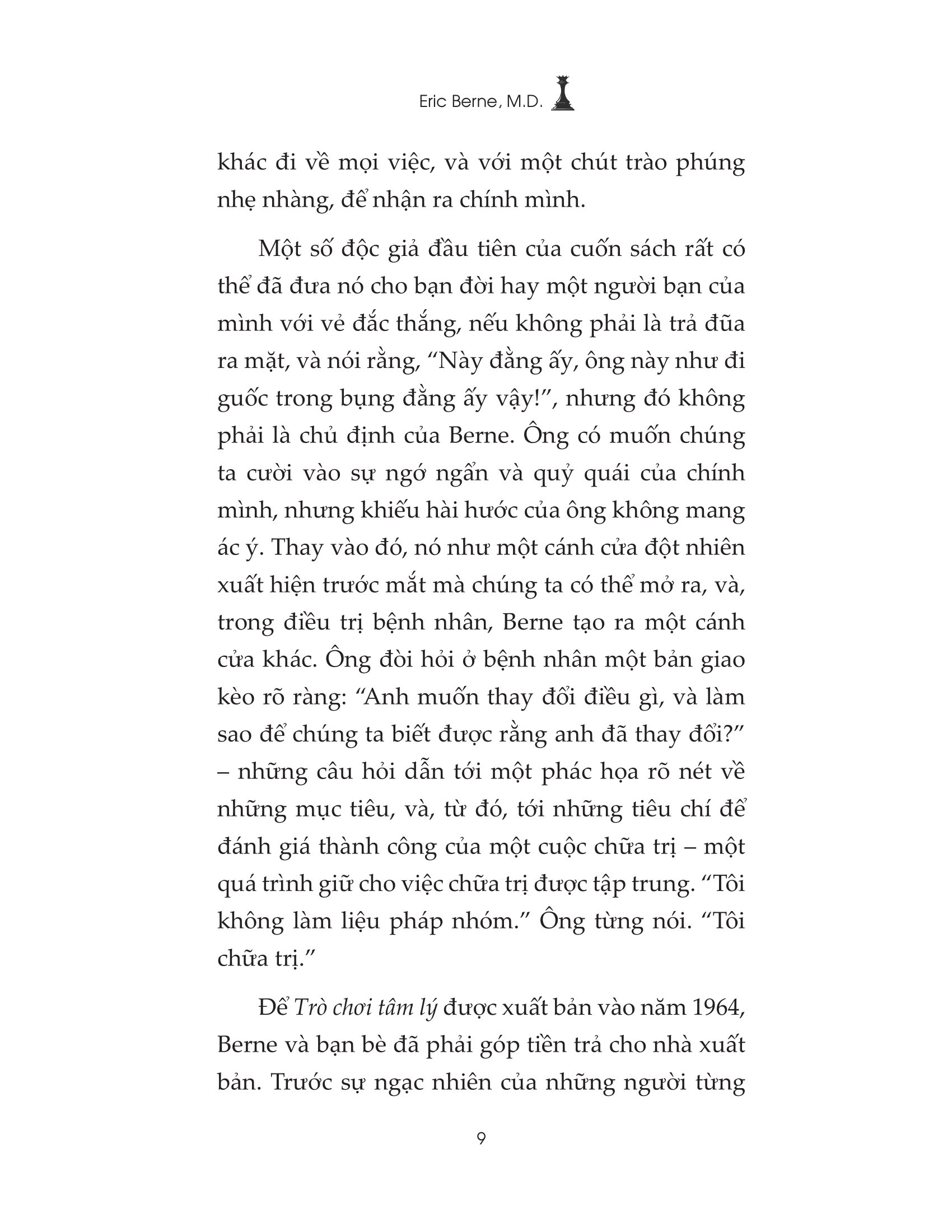 “Trò chơi tâm lý” là một cuốn sách kinh điển về hành vi của con người, giải thích những trò chơi tâm lý hoang dã và thú vị mà bạn và mọi người xung quanh bạn chơi để thao túng lẫn nhau đồng thời cũng đưa ra các cách chế ngự bản ngã của mình để bạn có thể ngừng chơi với những mối quan hệ độc hại và tận hưởng những mối quan hệ lành mạnh hơn.