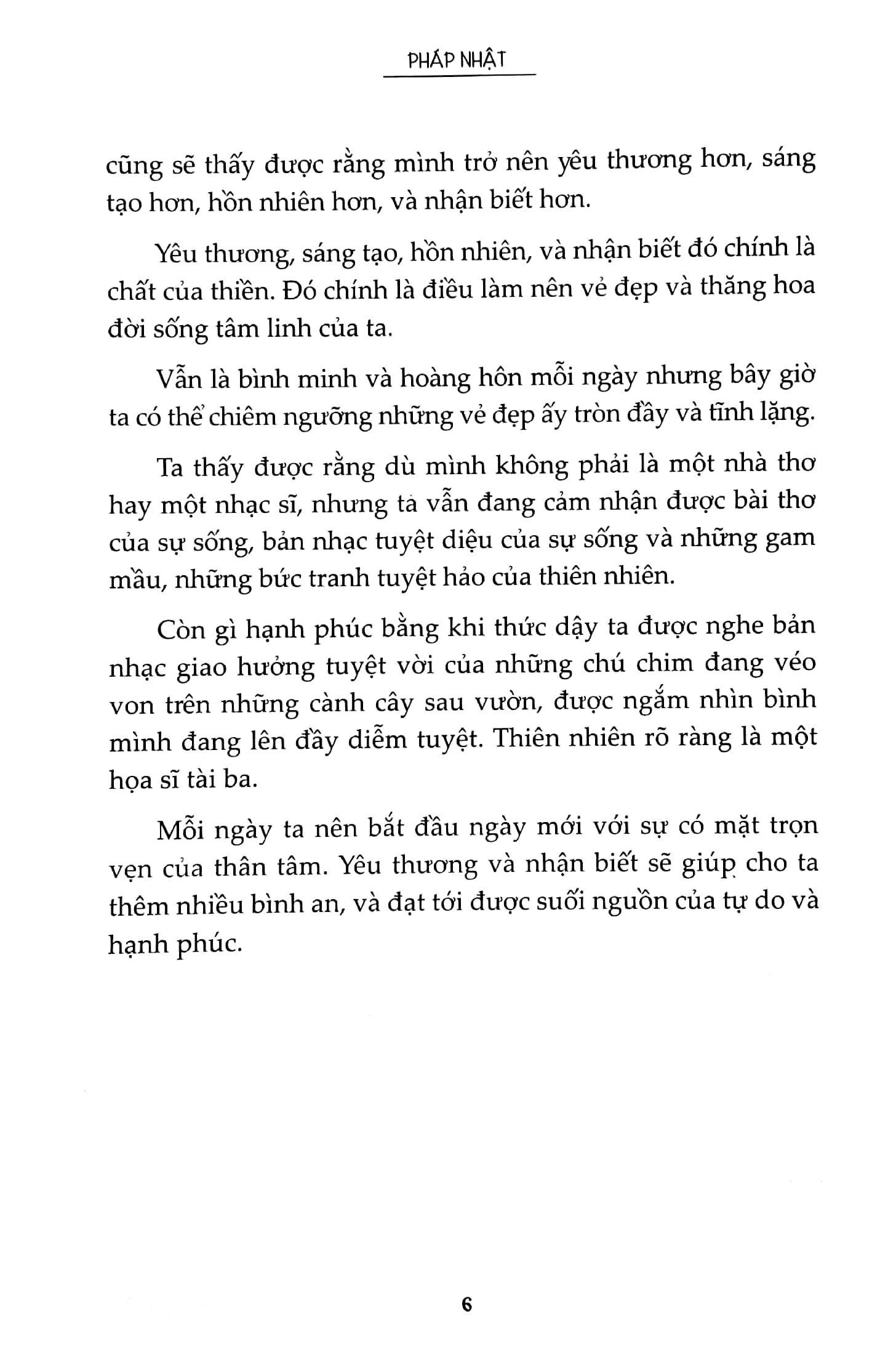 Đối với tác giả thì đón nhận cuộc sống tức là trọn vẹn với cuộc sống, là “kích hoạt” mọi giác quan để nghe, nhìn, cảm nhận, để trải nghiệm từng “hơi thở” của cuộc sống, để không bỏ lỡ bất cứ điều nhỏ bé - kỳ diệu nào. “Sáng nay thức dậy, tôi thấy bình an lạ. Thức dậy và mỉm cười để chào đón ngày mới đã thành thói quen của tôi. Mỉm cười khi thức dậy đã giúp tôi thắp sáng ý thức về hiện hữu. Những chú chim đang hót bên ngoài cửa sổ. Tiếng hót thánh thót, bình an. Tia nắng sớm đã vào thăm trà thất tự lúc nào. Tôi có thể cảm nhận được hơi ấm của nắng sớm đang lan tỏa trong phòng. Cuộc sống thật sự là một sự tận hưởng. Ta tận hưởng giây phút hiện tại đang là. Trong sự tận hưởng này có sự trở về và khám phá. Trở về với chính mình và khám phá vẻ đẹp của hiện hữu” (Hạnh phúc nơi cái đang là).