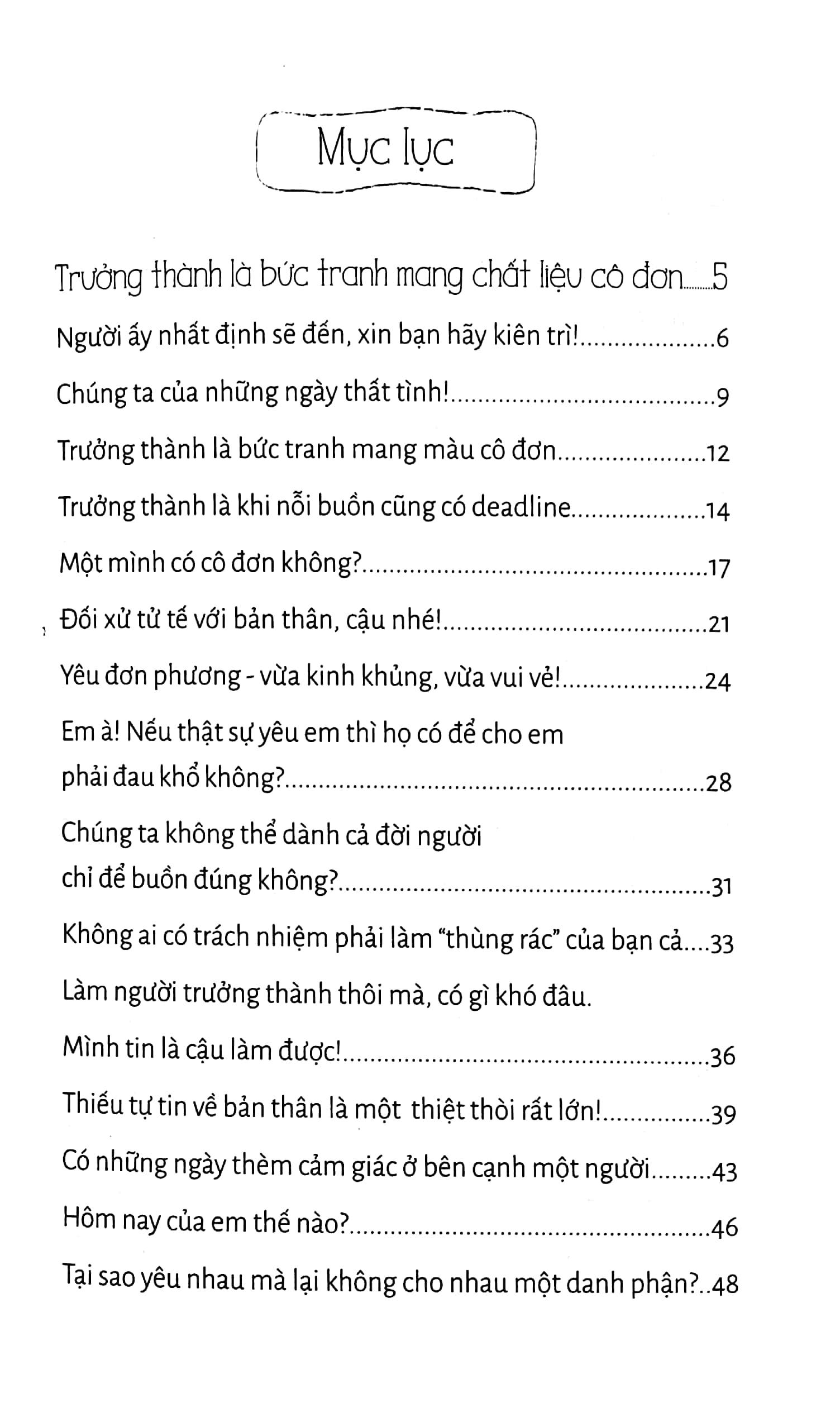 “Trưởng thành là khi nỗi buồn cũng có deadline” sẽ tưới mát sự cô đơn “héo mòn” từng ngày của bạn, kéo bạn phần nào thoát khỏi cuộc sống khắc nghiệt để giúp bạn nhận ra phía trước còn rất nhiều điều tốt đẹp, bạn không được từ bỏ mọi thứ dễ dàng như thế.