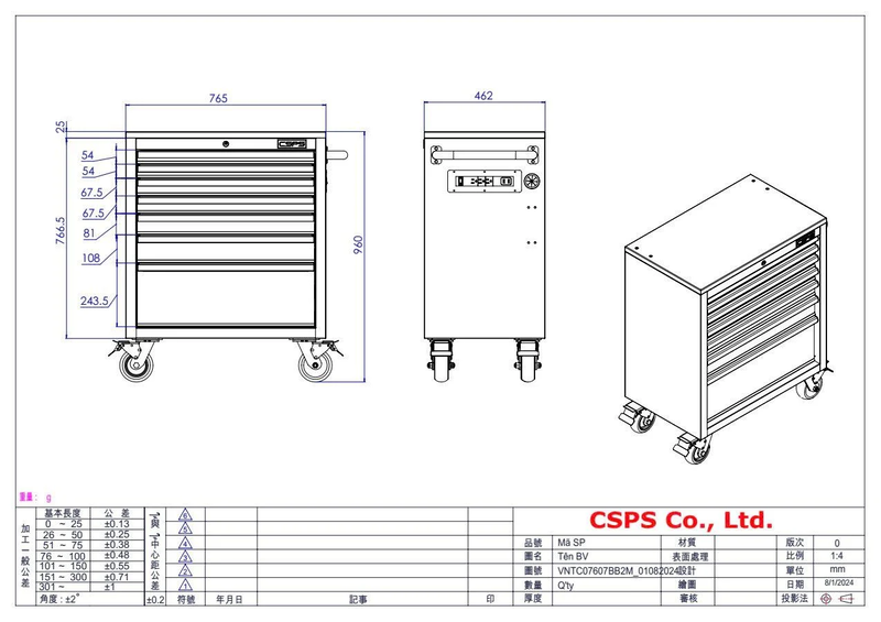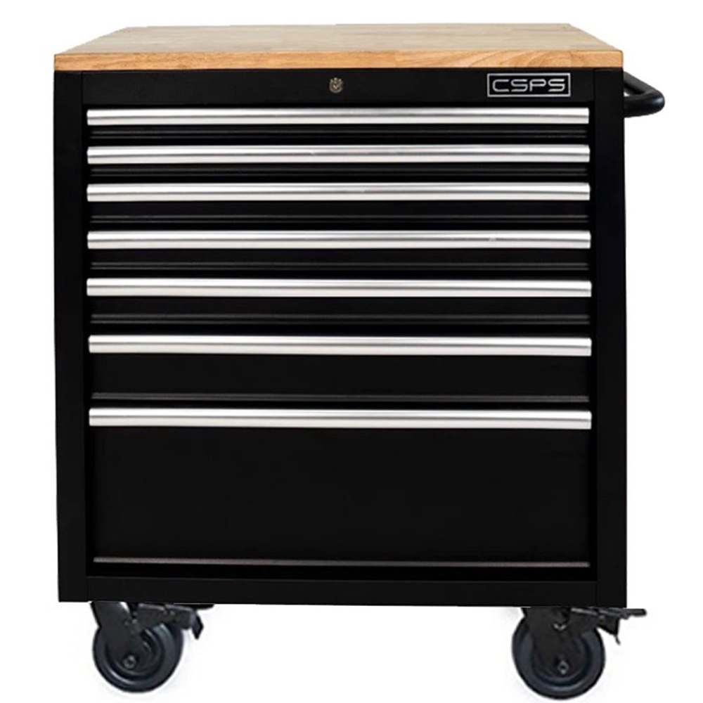 Tủ dụng cụ 7 ngăn kéo có mặt ván gỗ kèm ray đóng êm CSPS THÔNG SỐ KỸ THUẬT 1) THÔNG SỐ CHUNG Kích thước sản phẩm: 76,5 cm W x 46,2 cm D x
