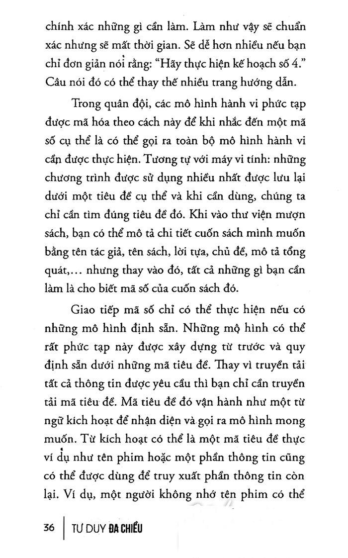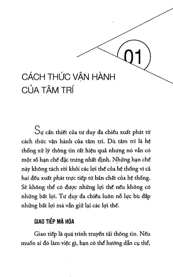 - Thực hành tư duy đa chiều NHƯ THẾ NÀO để sáng tạo và tái cấu trúc cách nhìn sự vật? Theo đó, tác giả đưa ra sự đối sánh giữa tư duy đa chiều và tư duy chiều dọc thông thường trên các phương diện như tính chất, đặc trưng, cách vận hành của từng loại tư duy, mục đích, và chỉ ra bản chất cơ bản và vai trò của tư duy đa chiều. Một số điểm nổi bật của tư duy đa chiều: