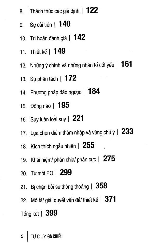 - Giải phóng khỏi các ý tưởng cũ và kích thích các ý tưởng mới là hai mặt song song của tư duy đa chiều. Edward de Bono đã dành từng chương để nói về từng kỹ thuật thực hành tư duy đa chiều. Các kỹ thuật cơ bản như: tạo ra những lựa chọn thay thế; thách thức các giả định; trì hoãn đánh giá; thiết kế; tái cấu trúc mô hình sử dụng các kỹ thuật như phân tách, đảo ngược,; suy luận loại suy; lựa chọn điểm thâm nhập và vùng chú ý; kích thích ngẫu nhiên; PO; Tuy tư duy đa chiều mới mẻ và trừu tượng với nhiều người, nhưng thông qua hệ thống ví dụ sử dụng hình ảnh trực quan, tư liệu ngôn ngữ gần gũi cùng những bài tập cuốn hút, de Bono đang dần khiến tư duy đa chiều trở thành một công cụ gần gũi với chúng ta ngày nay. Vậy thì: Ai sẽ cần tư duy đa chiều? Không chỉ những người tạo ra chiến lược hay làm việc về R&D (Nghiên cứu và Phát Triển) mà bất kể ai muốn rèn luyện để đổi mới, sáng tạo ý tưởng, phát triển khái niệm, giải quyết các vấn đề liên quan đến sáng tạo hay vạch ra một chiến lược để thách thức hiện trạng đều sẽ thu được rất nhiều lợi ích từ Tư duy đa chiều. Nếu bạn phải đổi mặt với những xu hướng thay đổi nhanh chóng, sự cạnh tranh khốc liệt và tình cảnh phải tạo ra những điều kì lạ thì bạn sẽ cần đến tư duy đa chiều! Sử dụng khái niệm để tạo ra những ý tưởng mới Công cụ tư duy đa chiều của Edward de Bono sử dụng những khái niệm để tạo ra ý tưởng mới. Hãy sẵn sàng tìm kiếm ý tưởng mới – ngay cả khi bạn không cần thiết phải làm như vậy – đó là bản chất của sự sáng tạo. Trở nên thông thạo về những khái niệm cơ sở sẽ giúp việc tìm kiếm ý tưởng mới trở nên dễ dàng hơn. Khái niệm là những ý tưởng chung và cách làm chung. Mỗi khái niệm phải được biến thành hành động thông qua những ý tưởng cụ thể. Suy nghĩ về những cách cụ thể để thực hiện một khái niệm là một cách tạo ra ý tưởng. Mỗi ý tưởng cụ thể có thể được khai thác để trở thành những khái niệm mới. Việc rút ra một khái niệm mới lại tạo ra một con đường hoàn toàn mới để tạo ra những ý tưởng cụ thể hơn. Về Tác Giả: Edward de Bono (sinh năm 1933, tại Malta) là bác sĩ, nhà tâm lý học, tác giả, nhà phát minh và tư vấn. Ông chính là người sáng tạo ra thuật ngữ “Tư duy đa chiều” (lateral thinking), trở thành một mục từ chính trong Từ điển tiếng Anh Oxford. Ông viết hơn 60 cuốn sách về tư duy và đã được dịch ra 34 ngôn ngữ trên thế giới. 6 Chiếc Mũ Tư Duy là một trong những cuốn sách tiêu biểu trong đó. Được mệnh danh là cha đẻ của “Tư duy về tư duy”, ông đã giảng dạy phương pháp tư duy của m.ình cho nhiều cơ quan chính phủ, doanh nghiệp và các tổ chức cá nhân trên toàn thế giới. Tác phẩm tiêu biểu nhất của ông sẽ được Alpha Books xuất bản ngày 15/8/2017 bao gồm: Dạy con cách tư duy Tư duy đa chiều Tôi đúng - Anh sai 6 Chiếc Mũ Tư Duy