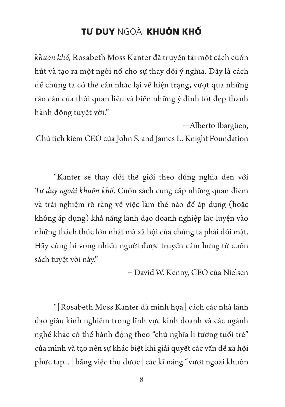 “Kanter sẽ thay đổi thế giới theo đúng nghĩa đen với Tư duy ngoài khuôn khổ. Cuốn sách cung cấp những quan điểm và trải nghiệm rõ ràng về việc làm thế nào để áp dụng (hoặc không áp dụng) khả năng lãnh đạo doanh nghiệp lão luyện vào những thách thức lớn nhất mà xã hội của chúng ta phải đối mặt. Hãy cùng hi vọng nhiều người được truyền cảm hứng từ cuốn sách tuyệt vời này.” - David W. Kenny, CEO của Nielsen