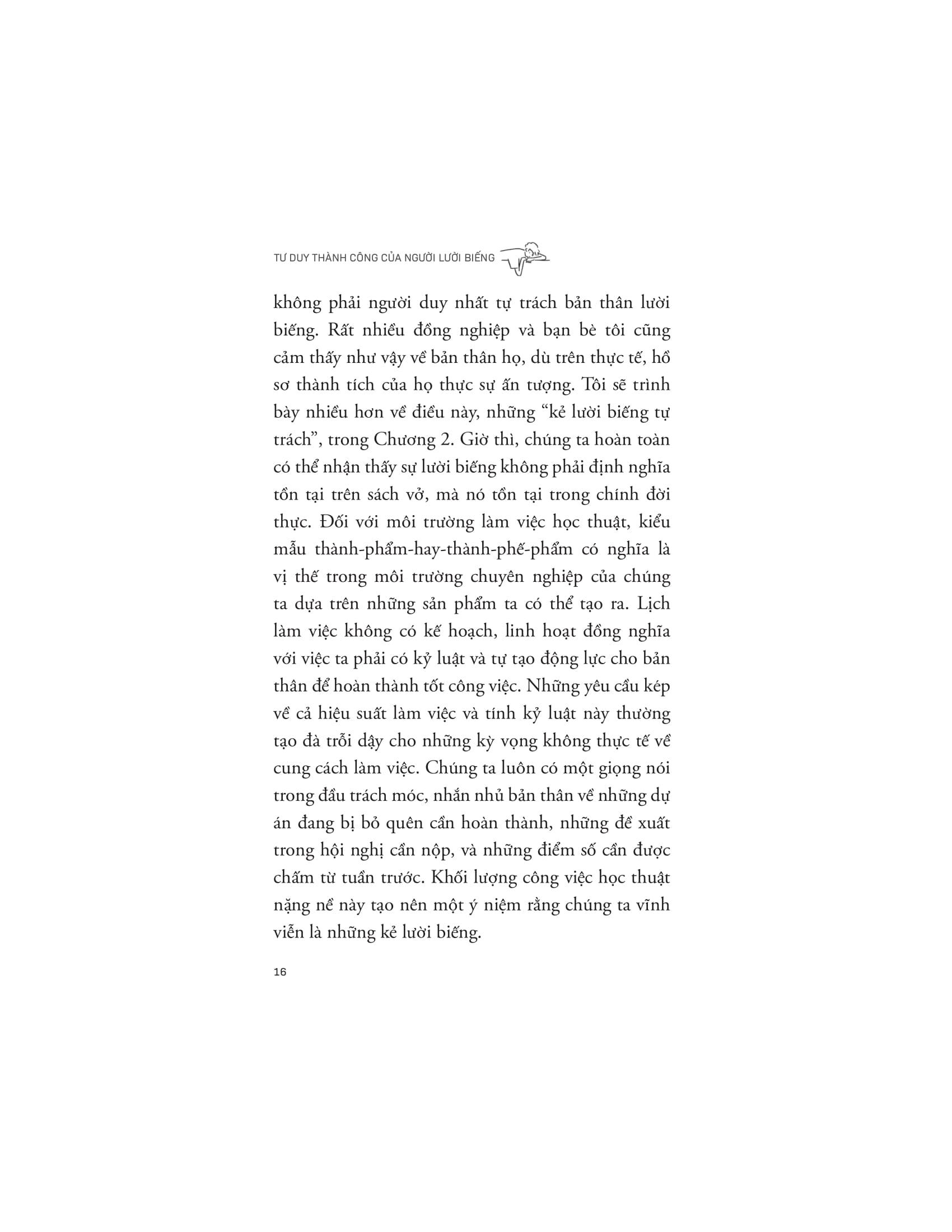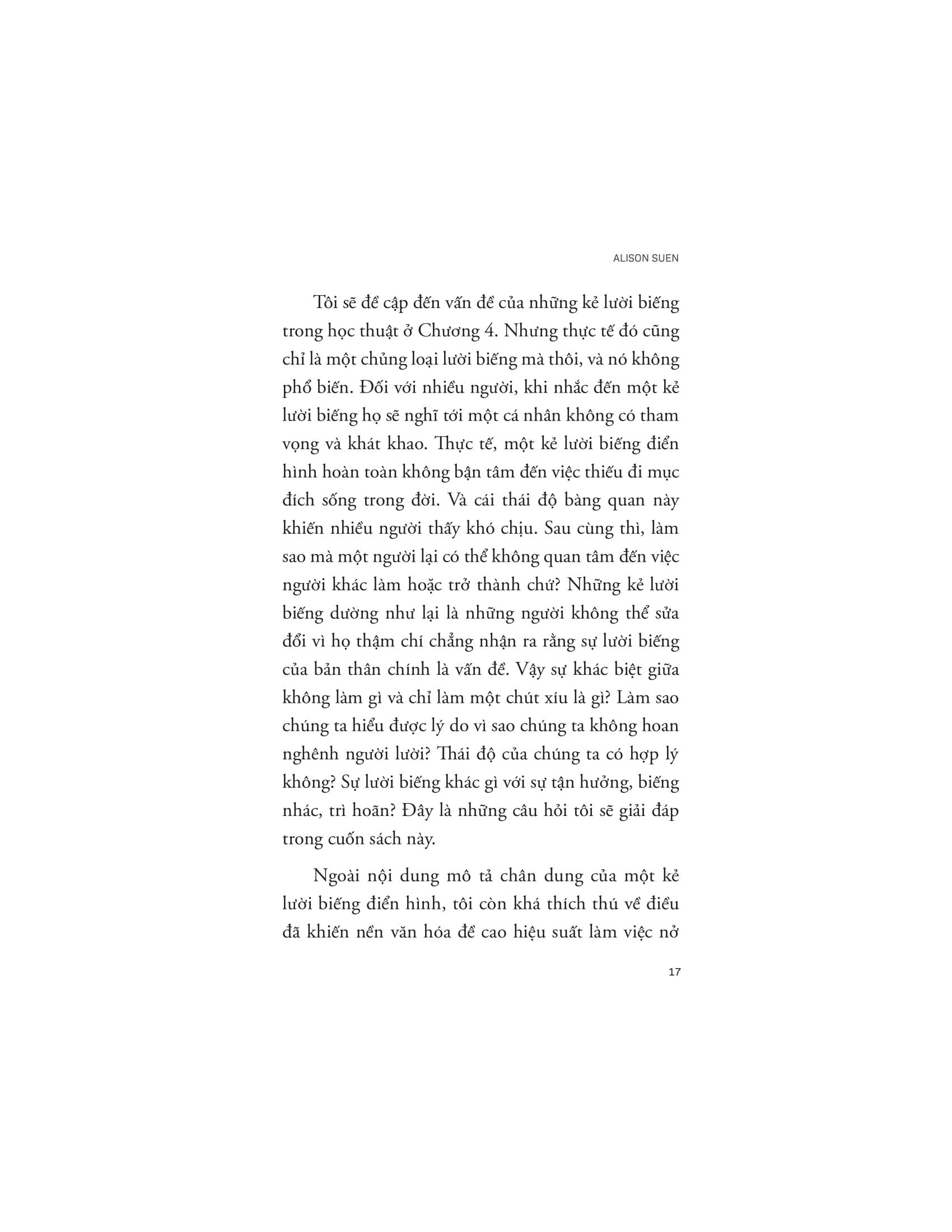 Tuy cuốn sách này bào chữa cho sự lười biếng, nhưng nó không hề bênh vực lối sống lười biếng. Bằng việc nghiên cứu văn hóa phát huy hiệu suất làm việc, Suen đã nhận định một thực tế rằng đôi khi lười biếng không hề xấu, họ là những người có tư duy khác biệt và thách thức các quan niệm thường thấy về thành công.