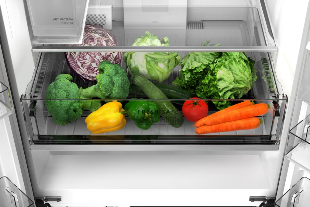 - Ngăn rau củ Fresh Safe bảo quản rau củ tươi ngon lâu hơn nhờ trang bị bộ lọc kiểm soát độ ẩm lên đến 90%. - Ngăn cấp đông mềm thế hệ mới Prime Fresh có dung tích lớn 41 lít, bảo quản thực phẩm ở chuẩn -3 °C nhanh gấp 4 lần, giảm 20% tình trạng oxi hóa vào bảo quản chúng tươi ngon lên đến 7 ngày mà không đóng tuyết giúp chế biến không cần rã đông. Ngăn đá