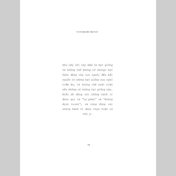 As a man thinketh – Từ vô minh đến tỉnh thức là tuyển tập những tác phẩm nổi tiếng nhất của triết gia thiên tài người Anh – James Allen. Cuốn sách này là những dòng suy ngẫm của tác giả về bản chất con người, với tư cách là một cá thể độc lập cũng như một thành viên của xã hội. Thế giới bên ngoài, rực rỡ, đẹp đẽ hay tăm tối xấu xa, hoàn toàn phụ thuộc vào cách ta nuôi dưỡng thế giới nội tâm của mình. Trong hành trình vun xới cho khu vườn tâm trí ấy, liệu ta có biếng lười mà thả mình theo những cám dỗ ngọt ngào hiểm ác, hay sẽ can đảm lựa chọn một con đường dẫu gian lao nhưng lương thiện, trong sáng và được ban phước lành?
