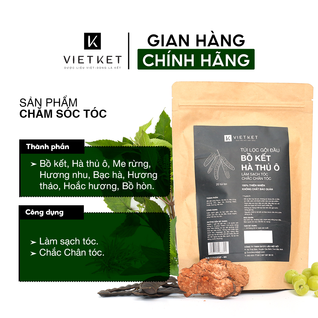 TÚI LỌC GỘI ĐẦU BỒ KẾT HÀ THỦ Ô VIETKET (20 gói) - NUÔI DƯỠNG MAI TÓC MỀM, MƯỢT, KHỎE MẠNH Nguyên liệu: Bồ kết rang thơm, amla, hương nhu, bạc hà, hoắc hương, hương