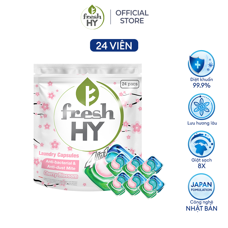 Sử dụng công nghê Nhật Bản, viên giặt xả tiện lợi 4in1 Fresh Hy giúp tẩy rửa, làm mềm, khử trùng và bảo vệ màu chỉ trong 1 viên nang giúp quần áo luôn mềm