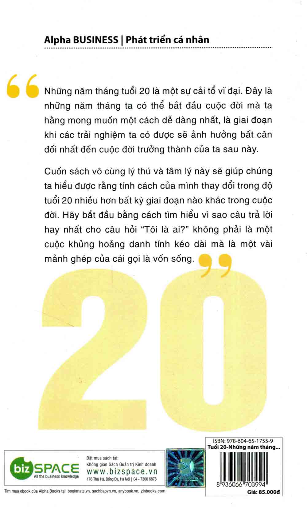 Những năm tháng của tuổi 20 là một sự cải tổ vĩ đại. Đây là những năm tháng ta có thể bắt đầu cuộc đời mà ta hằng mong muốn một cách dễ dàng nhất, là giai đoạn khi các trải nghiệm ta có được sự ảnh hưởng bất cân đối nhất đến cuộc đời trưởng thành của ta sau này. Tuổi 20 – Những năm tháng quyết định cuộc đời bạn là cuốn sách vo cùng lý thú và tâm lý này sẽ giúp chúng ta hiểu được rằng tính cách của mình thay đổi trong độ tuổi 20 nhiều hơn bất kỳ giai đoạn nào khác trong cuộc đời.