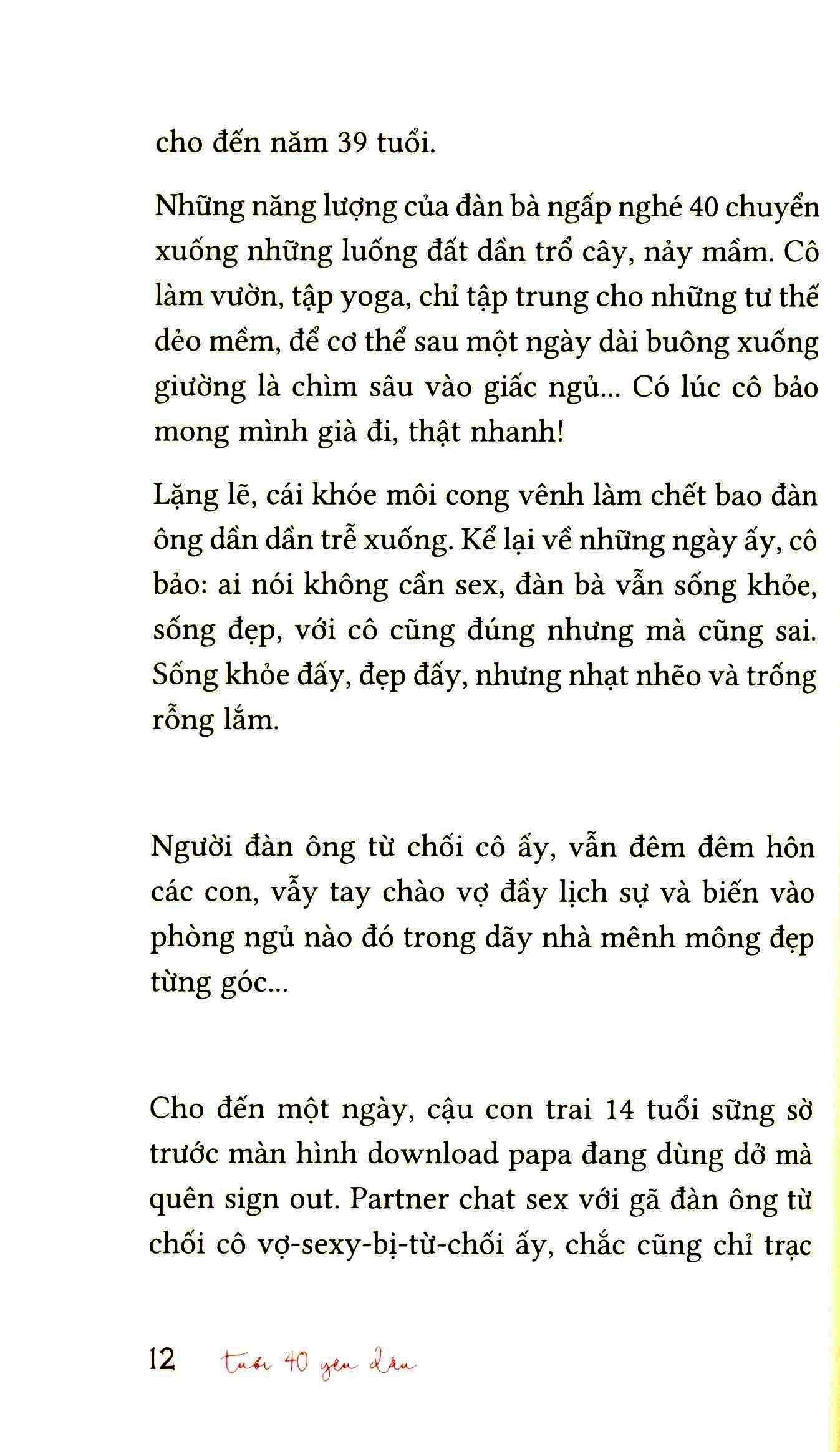 Và đây, không bắt buộc… mà tất cả chữ cứ tự chảy. Dường như cuộc sống của những phụ nữ sắp bước vào tuổi 40, đang 40 hay vừa qua tuổi 40 đểu rạng rỡ, nồng nàn và buộc chị phải viết về họ, để tự hào về họ và chính m.ình.