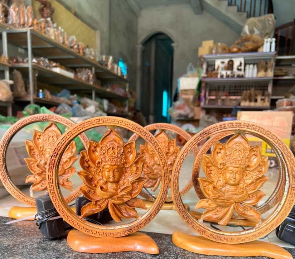 Diện phật được làm bằng chất liệu gỗ hương đá tự nhiên 100% Kt tròn 20×20×6cm _ Diện phật được trạm khắc tỉa mỉ ,tinh sảo kỳ công à được lắp thêm bóng đèn viền thắp sáng lúc tối ,Đi hầu hết tất cả mọi chi tiết góc ngách nội dung hoa văn của tượng đều được gọt tỉa chỉnh sửa hoàn toàn bằng tay thủ công .Diện phật được làm và hoàn thiện do bàn tay khối óc tài hoa .Từ những người thợ dầy dặn kinh nghiệm cũng như tay nghề cao trong làng nghề truyền thống .Chính vì thế diện phật bằng gỗ hương đã đáp ứng đầy đủ mọi tiêu trí cần thiết như ,( Đẹp bền rẻ ) Thẩm mỹ nghệ thuật với chất lượng tuyệt vời
