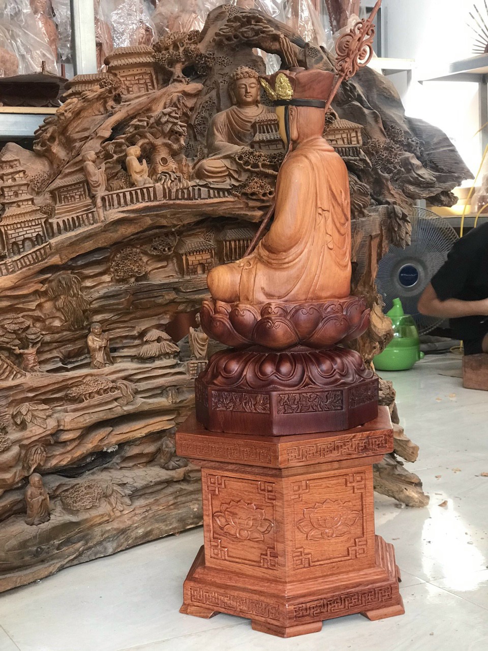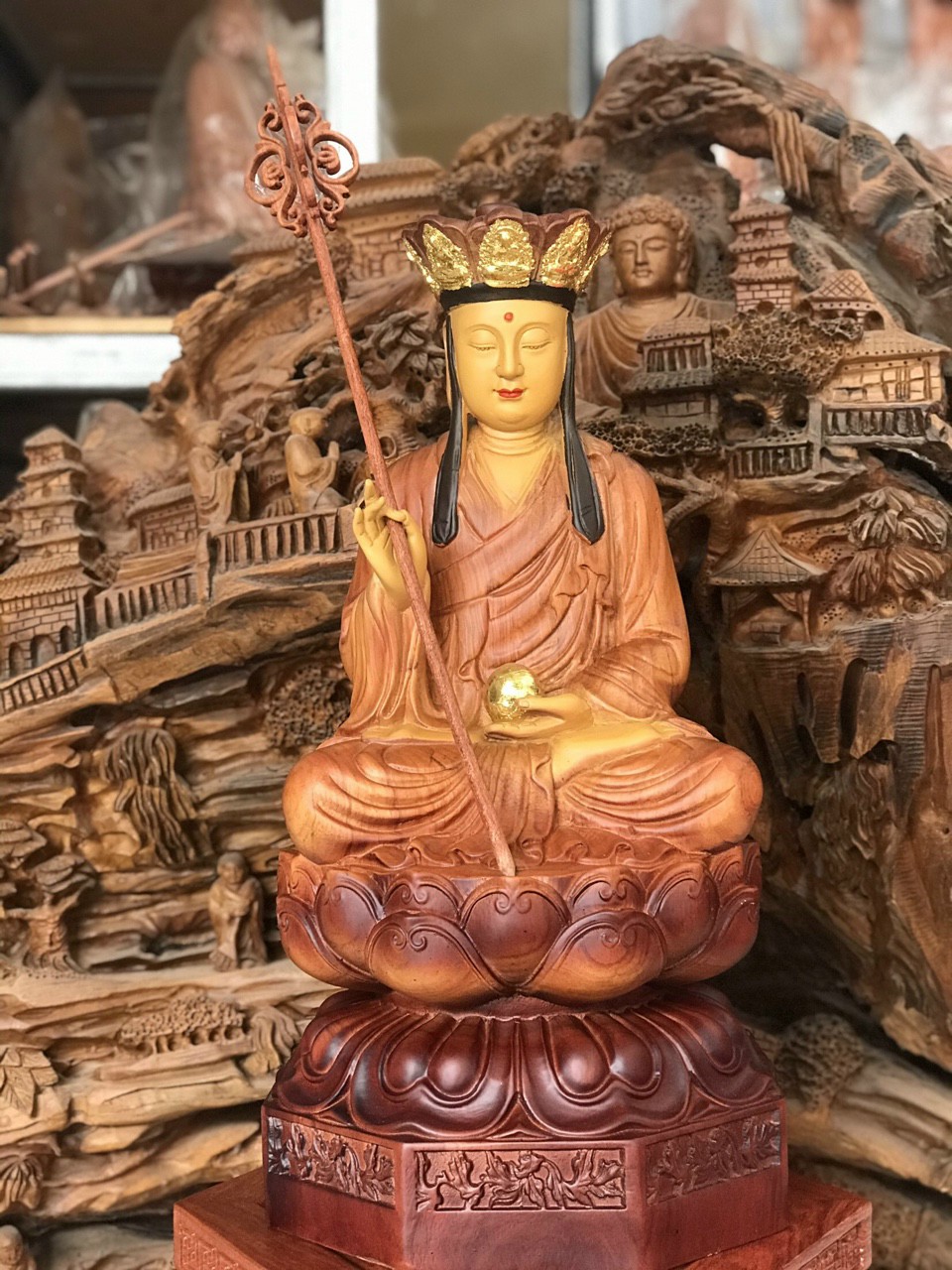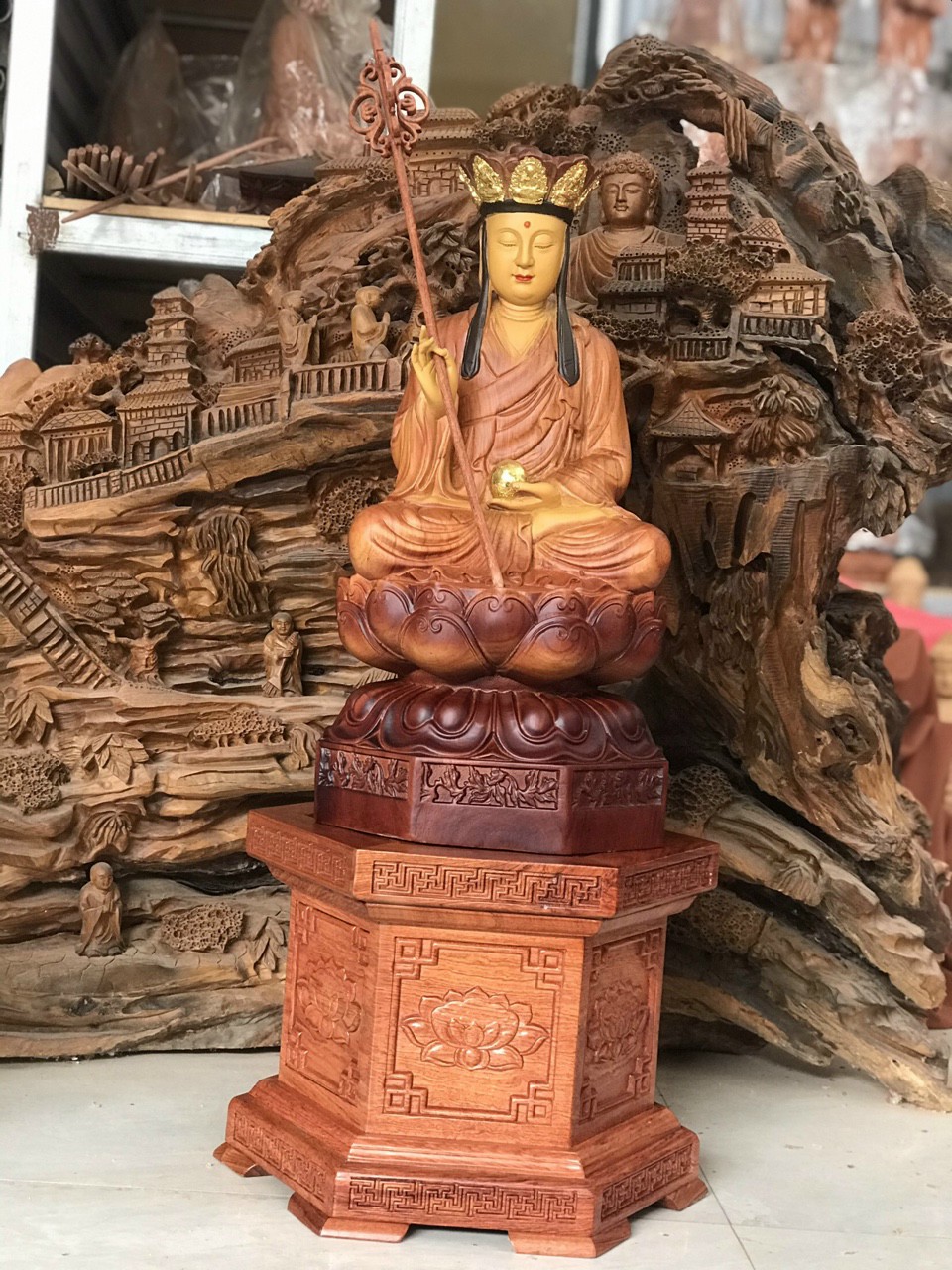 Tượng phật địa tạng vương bồ tát được làm bằng chất liệu gỗ hương đá liền khối tô làm mầu giả cổ Kích thước cao 40×15×15cm _ Tượng phật địa tạng vương bồ tát được trạm khắc tỉ mỉ tinh sảo kỳ công ,Tượng được làm và hoàn thiện do bàn tay khối óc tài hoa ,Từ những người thợ dầy rặn kinh nghiệm cũng như tay nghề cao trong làng nghề nghề truyền thống ,Chính vì thế tượng phật đị tạng vương bồ tát đã đáp ứng đầy đủ những tiêu trí ( Đẹp bền rẻ ) Thẩm mỹ nghệ thuật với chất lượng tuyệt vời