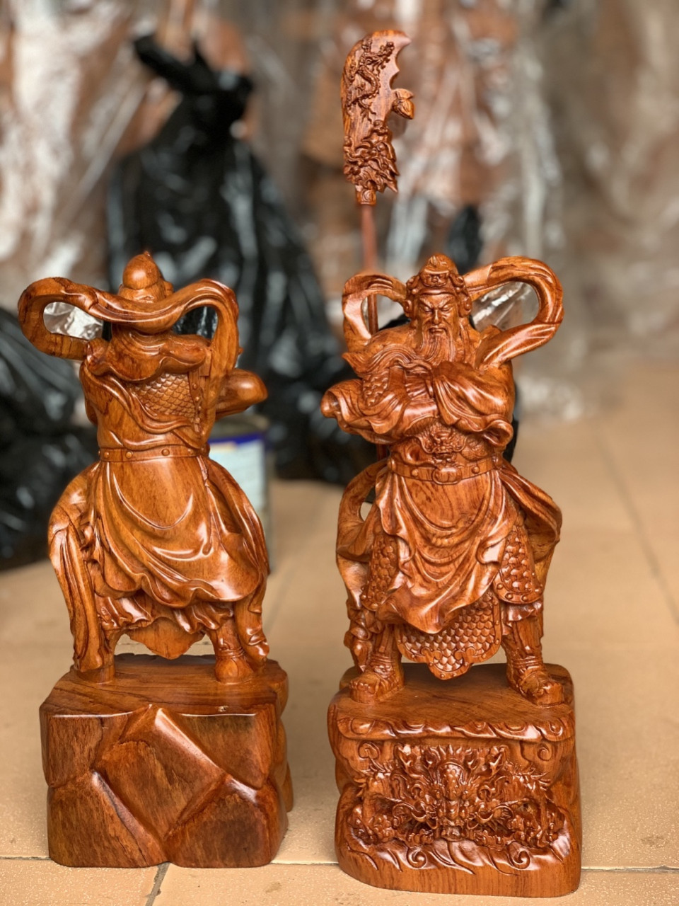 Tượng quan công cầm đao đứng trên đầu hổ phù được làm bằng chất liệu gỗ hương đá tự nhiên 100% Kích thước cao 40×16×11cm _ Tượng quan công khoanh tay cầm đao đứng trên đầu hổ phù được trạm khắc tỉ mỉ tinh sảo kỳ công .Từ những người thợ dầy rặn kinh nghiệm ,Cũng như tay nghề cao trong làng nghề truyền thống .Chính vì thế tượng quan công khoanh tay đã đáp ứng đầy đủ những tiêu trí ( Đẹp bền rẻ ) Thẩm mỹ nghệ thuật với chất lượng tuyệt vời