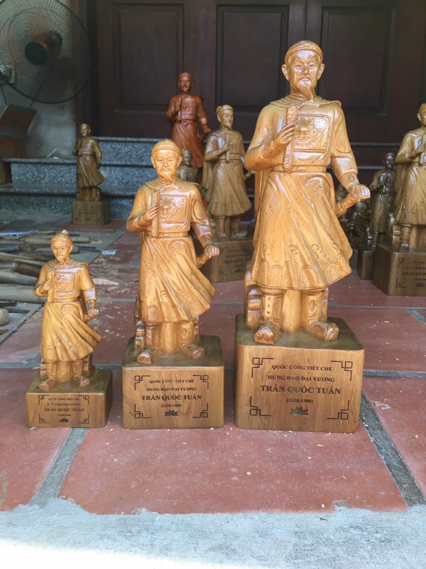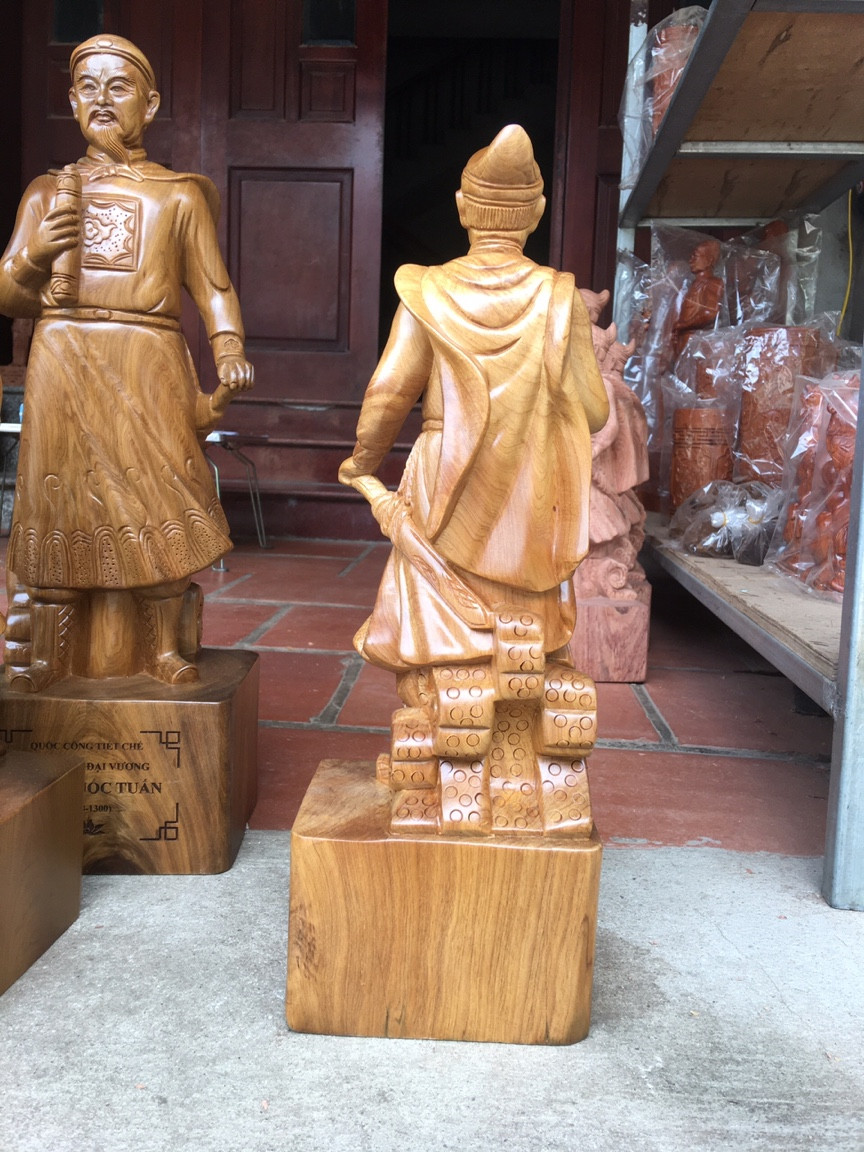 - Kích thước cao 60×20×15cm Tượng trần quốc tuấn trần hương đạo vương được điêu khắc trạm trổ vô cùng tỉ mỉ ,tinh sảo kỳ công .Đi hầu hết tất cả mọi chi tiết góc ngách nội dung hoa văn của tượng đều được gọt tỉa chỉnh sửa hoàn toàn bằng tay thủ công .Đồng thời tượng được kiểm định kỹ lưỡng khắt khe ,như cho vào thẩm sấy cho gỗ khô kiệt .Mục đích trống dập nứt vênh mo mối mọt .Kết hợp với trà nhám, đánh giấy giáp nhiều nước sờ mát lạnh .Rồi cho vào phun lót làm ,bóng mờ để giữ lại mầu sắc vân gỗ tự nhiên .Tượng được làm và hoàn thiện do bàn tay khối óc tài hoa .Từ những người thợ giàu kinh nghiệm ,Cũng như tay nghề cao trong làng nghề truyền thống .Chính vì thế tượng trần quốc tuấn ,trần hưng đạo vương đã đáp ứng đầy đủ những tiêu trí ( Đẹp bền rẻ ) Thẩm mỹ nghệ thuật với chất lượng tuyệt vời