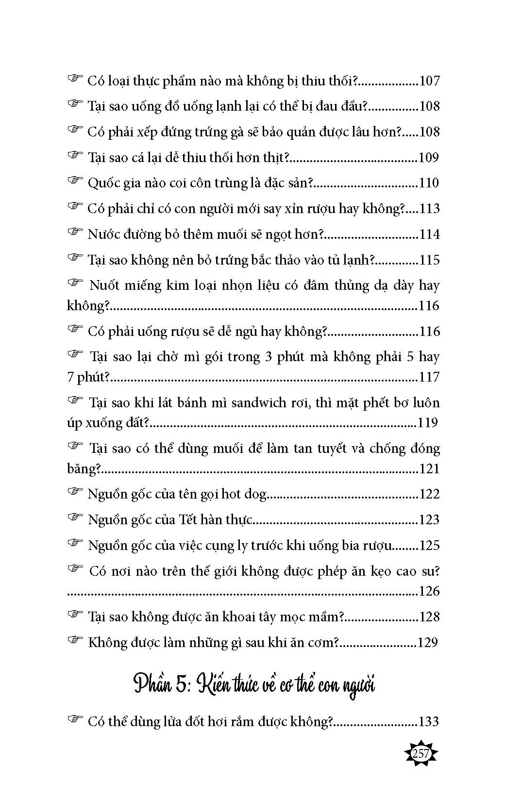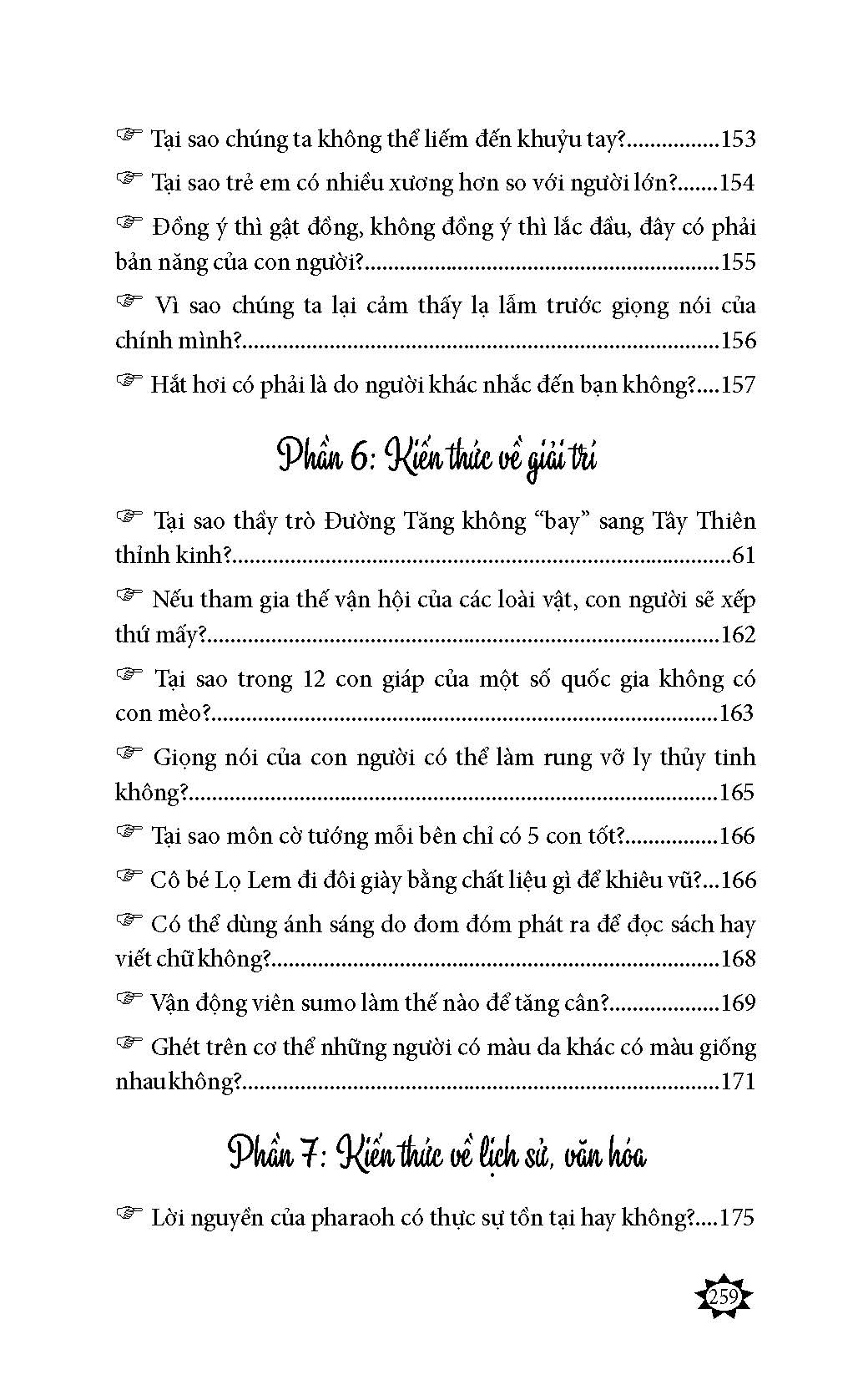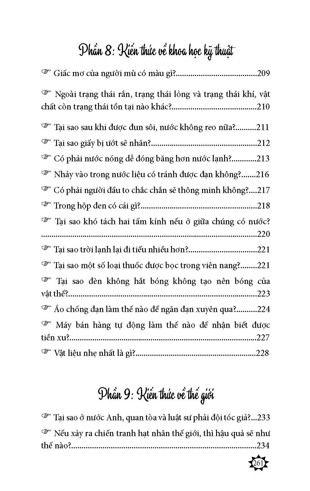 Sách cung cấp các kiến thức về cuộc sống, sức khỏe, động vật, ẩm thực, cơ thể con người, giải trí, lịch sử, văn hóa, khoa học kỹ thuật, về thế giới…nhằm giúp chúng