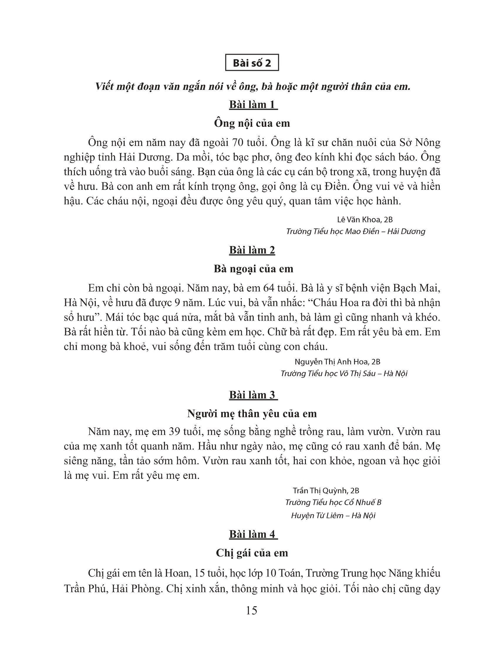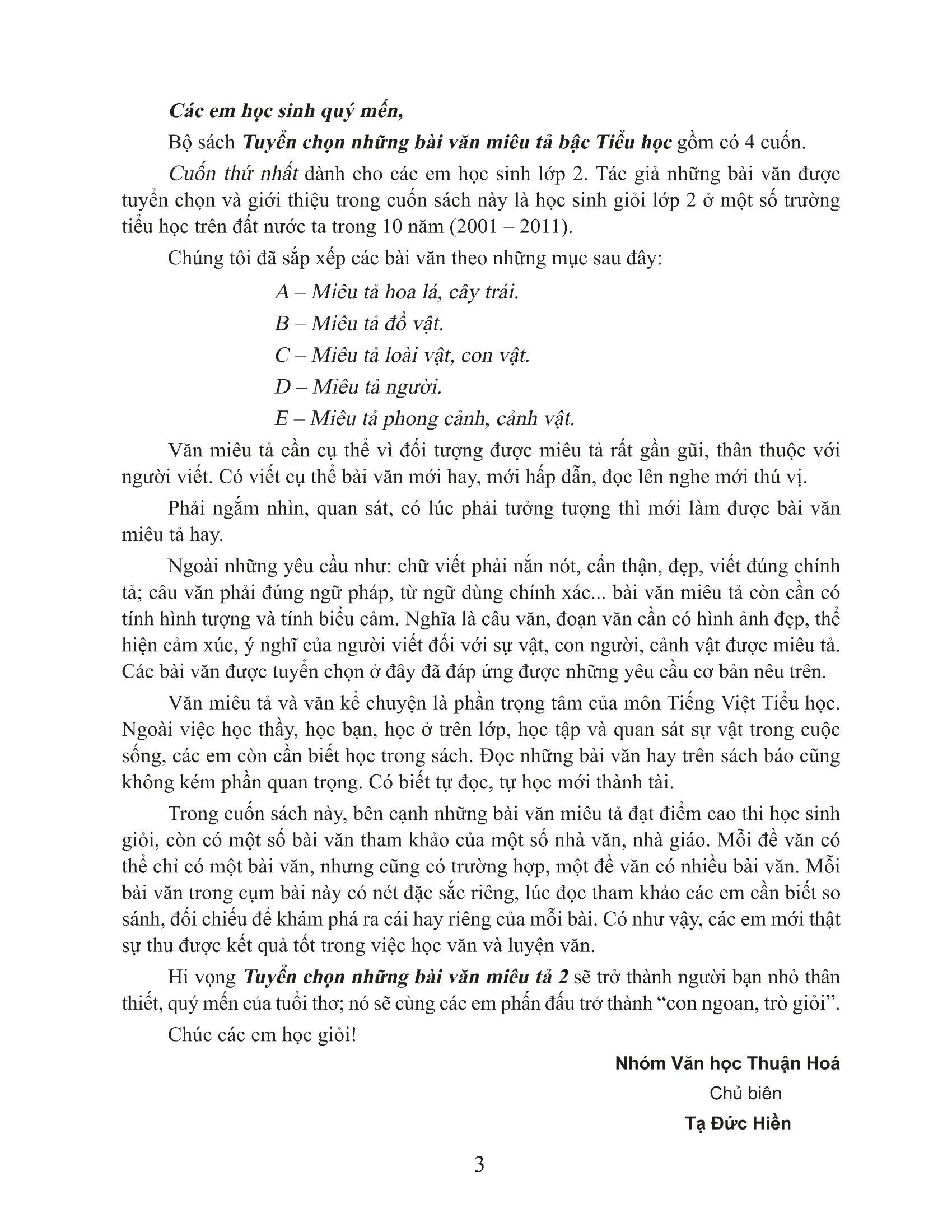 Ngoài những yêu cầu như: chữ viết phải nắm nót, cẩn thận, đẹp, viết đúng chính tả; câu văn phải đúng ngữ pháp, từ ngữ dùng chính xác,ì bài văn miêu tả còn cần có tính hình tượng và tính biểu cảm. Nghĩa là câu văn, đoạn văn cần có hình ảnh đẹp, thể hiện cảm xúc, ý nghĩa của người viết đối với sự vật, con người, cảnh vật được miêu tả. Các bài văn được tuyển chọn ở đây đã đáp ứng những yêu cầu cơ bản được nêu lên.