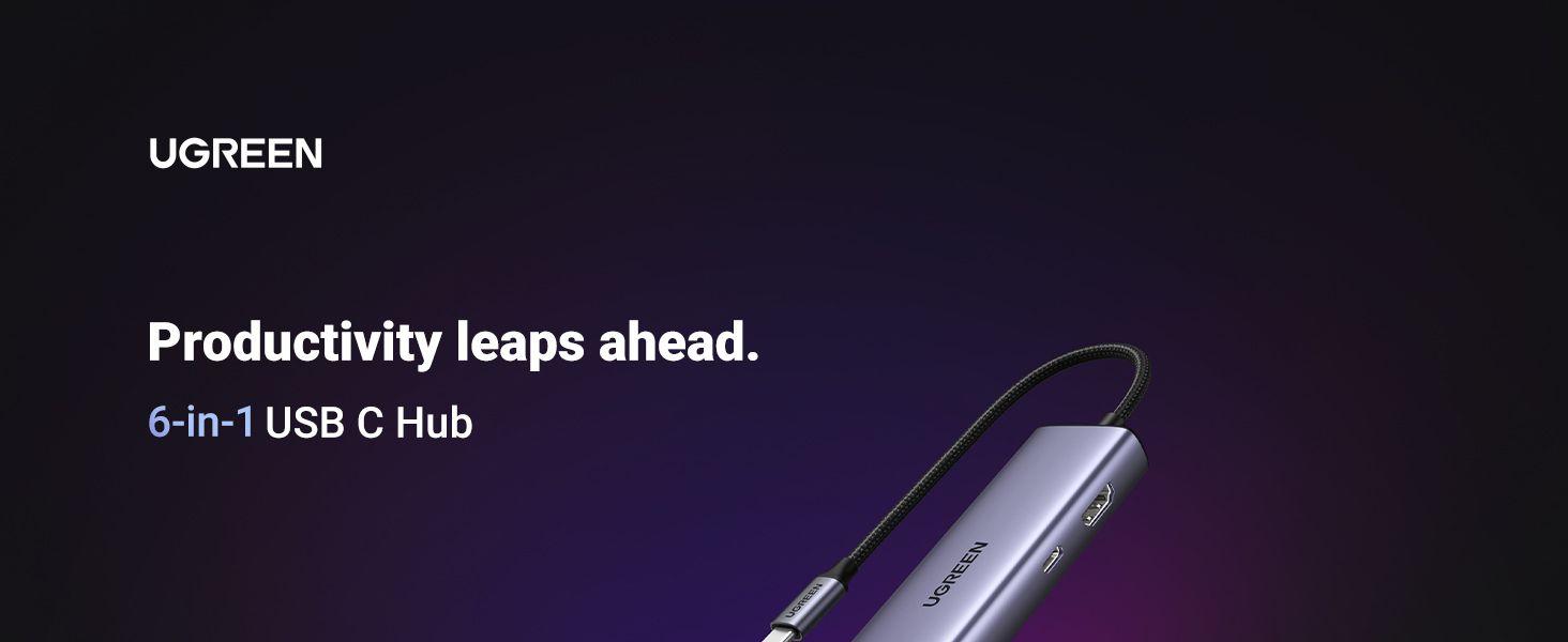 1. Hub đa năng 6 trong 1 Ugreen 80129 giúp bạn mở rộng từ 1 cổng USB Type C sang các cổng khác như HDMI, USB 3.0, khe đọc thẻ nhớ. Giúp bạn kết nối